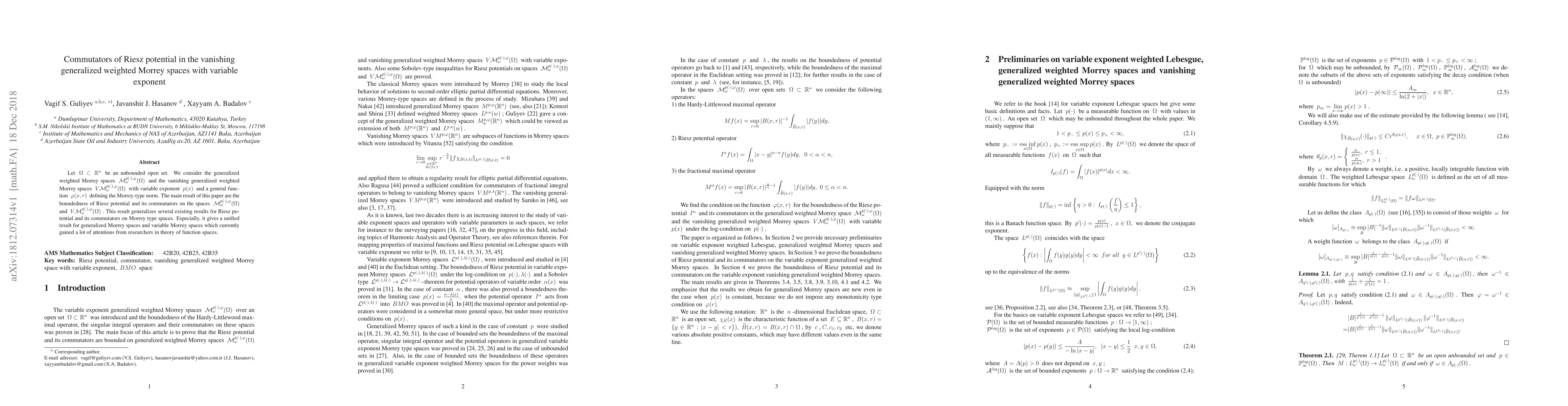 Let $\Omega \subset \mathbb{R}^n$ be an unbounded open set. We consider the generalized weighted Morrey spaces $\mathcal{M}^{p(\cdot),\varphi}_{\omega}(\Omega)$ and the vanishing generalized weighted Morrey spaces $V\mathcal{M}^{p(\cdot),\varphi}_{\omega}(\Omega)$ with variable exponent $p(x)$ and a general function $\varphi(x,r)$ defining the Morrey-type norm. The main result of this paper are the boundedness of Riesz potential and its commutators on the spaces $\mathcal{M}^{p(\cdot),\varphi}_{\omega}(\Omega)$ and $V\mathcal{M}^{p(\cdot),\varphi}_{\omega}(\Omega)$. This result generalizes several existing results for Riesz potential and its commutators on Morrey type spaces. Especially, it gives a unified result for generalized Morrey spaces and variable Morrey spaces which currently gained a lot of attentions from researchers in theory of function spaces.