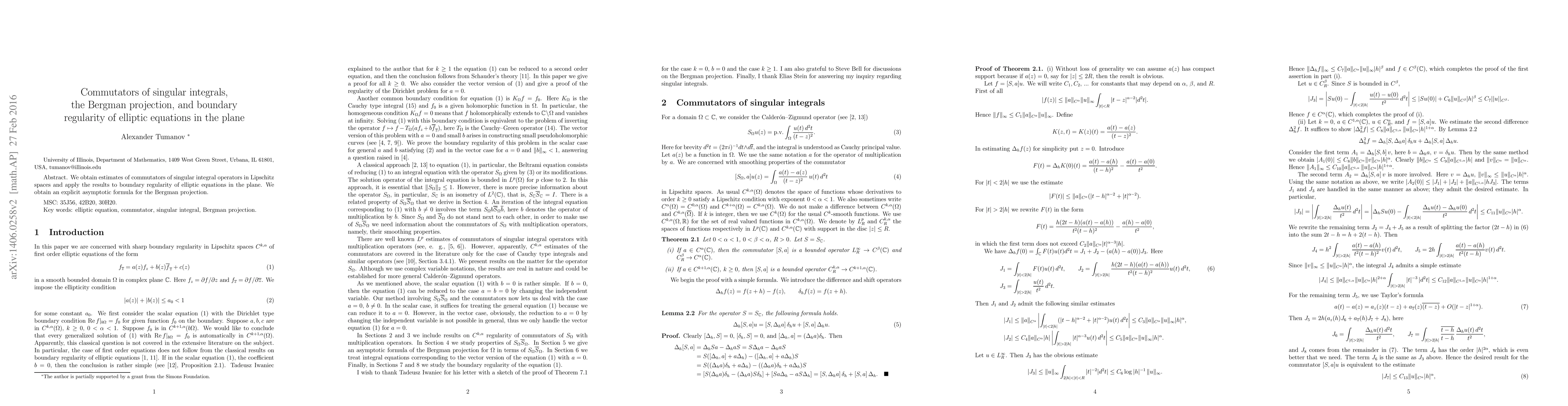 We obtain estimates of commutators of singular integral operators in Lipschitz spaces and apply the results to boundary regularity of elliptic equations in the plane. We obtain an explicit asymptotic formula for the Bergman projection.