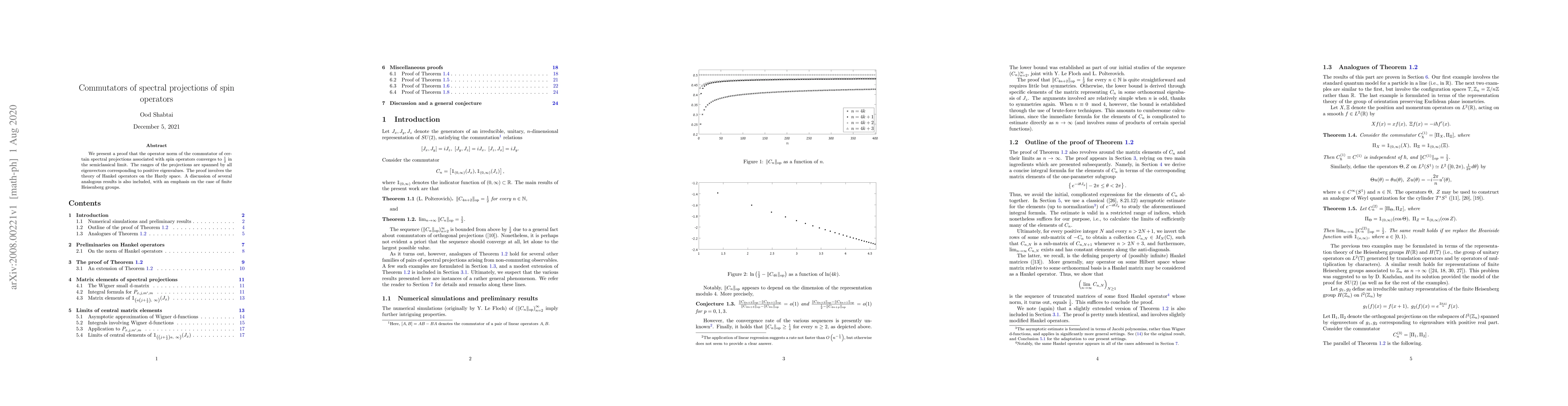 We present a proof that the operator norm of the commutator of certain spectral projections associated with spin operators converges to $\frac 1 2$ in the semiclassical limit. The ranges of the projections are spanned by all eigenvectors corresponding to positive eigenvalues. The proof involves the theory of Hankel operators on the Hardy space. A discussion of several analogous results is also included, with an emphasis on the case of finite Heisenberg groups.