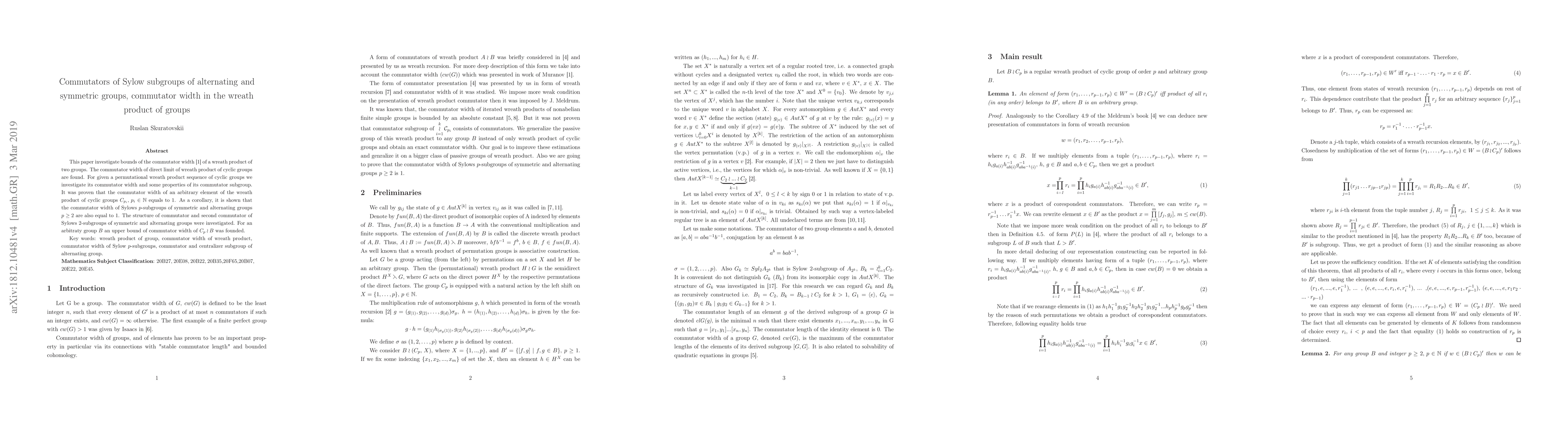 This paper investigate bounds of the commutator width \cite {Mur} of a wreath product of two groups. The commutator width of direct limit of wreath product of cyclic groups are found. For given a permutational wreath product sequence of cyclic groups we investigate its commutator width and some properties of its commutator subgroup. It was proven that the commutator width of an arbitrary element of the wreath product of cyclic groups $C_{p_i}, \, p_i\in \mathbb{N} $ equals to 1. As a corollary, it is shown that the commutator width of Sylows $p$-subgroups of symmetric and alternating groups $p \geq 2$ are also equal to 1. The structure of commutator and second commutator of Sylows $2$-subgroups of symmetric and alternating groups were investigated. For an arbitraty group $B$ an upper bound of commutator width of $C_p \wr B$ was founded. For an arbitraty group $B$ commutator width of $C_p \wr B$ was founded. Also commutator width of Sylow 2-subgroups of alternating group ${A_{{2^{k}}}}$, permutation group ${S_{{2^{k}}}}$ are founded. The result of research are extended on subgroups $(Syl_2 {A_{{2^{k}}}})'$, $p\geq2$. The structure of commutator subgroup of Sylow 2-subgroups of symmetric and alternating groups is investigated. Portrait representation of $(Syl_2 {A_{{2^{k}}}})'$, $(Syl_2 {S_{{2^{k}}}})'$ was investigated.