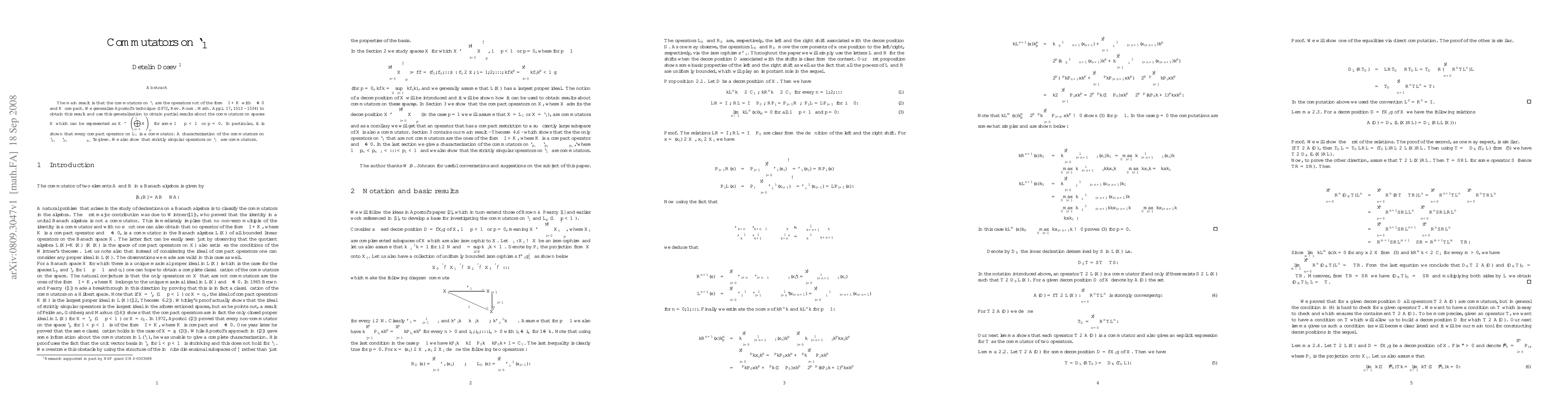 The main result is that the commutators on $\ell_1$ are the operators not of the form $\lambda I + K$ with $\lambda\neq 0$ and $K$ compact. We generalize Apostol's technique (1972, Rev. Roum. Math. Appl. 17, 1513 - 1534) to obtain this result and use this generalization to obtain partial results about the commutators on spaces $\X$ which can be represented as $\displaystyle \X\simeq (\bigoplus_{i=0}^{\infty} \X)_{p}$ for some $1\leq p<\infty$ or $p=0$. In particular, it is shown that every compact operator on $L_1$ is a commutator. A characterization of the commutators on $\ell_{p_1}\oplus\ell_{p_2}\oplus...\oplus\ell_{p_n}$ is given. We also show that strictly singular operators on $\ell_{\infty}$ are commutators.