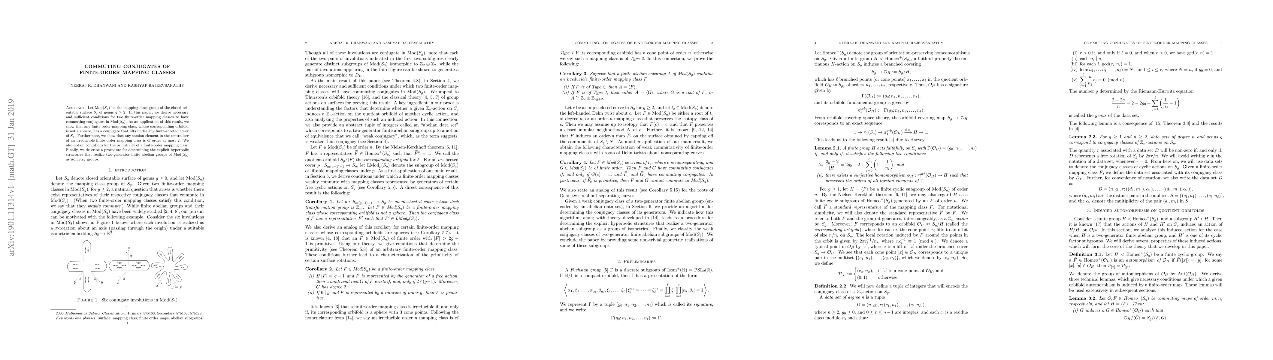 Let $\text{Mod}(S_g)$ be the mapping class group of the closed orientable surface $S_g$ of genus $g\geq 2$. In this paper, we derive necessary and sufficient conditions for two finite-order mapping classes to have commuting conjugates in $\text{Mod}(S_g)$. As an application of this result, we show that any finite-order mapping class, whose corresponding orbifold is not a sphere, has a conjugate that lifts under any finite-sheeted cover of $S_g$. Furthermore, we show that any torsion element in the centralizer of an irreducible finite order mapping class is of order at most $2$. We also obtain conditions for the primitivity of a finite-order mapping class. Finally, we describe a procedure for determining the explicit hyperbolic structures that realize two-generator finite abelian groups of $\text{Mod}(S_g)$ as isometry groups.