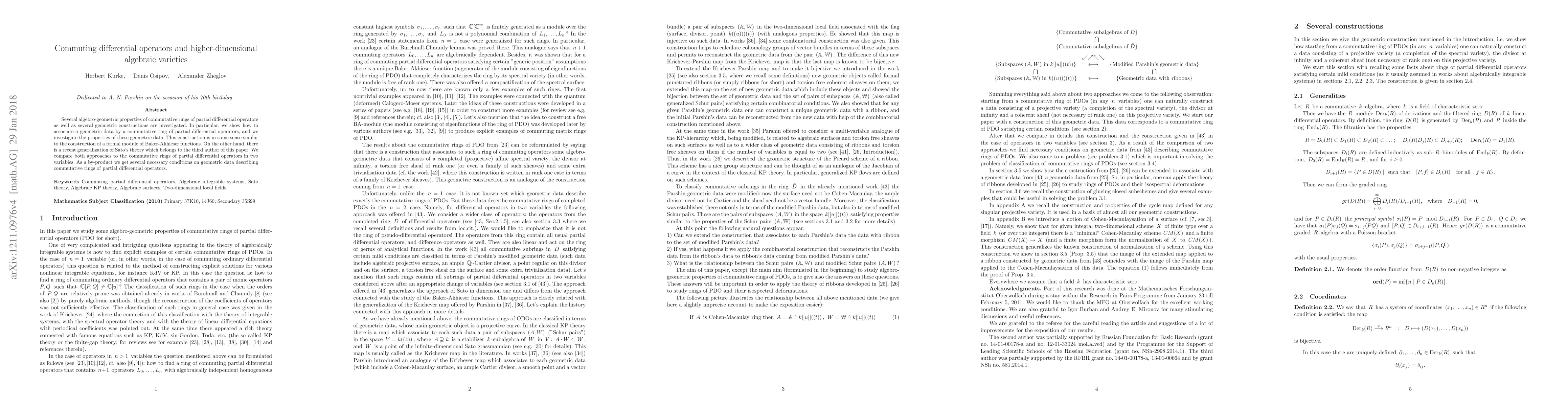 This paper investigates the algebro-geometric properties of commutative rings of partial differential operators and their geometric constructions, associating geometric data with these rings. It compares these constructions with a recent generalization of Sato's theory, focusing on two-variable operators.