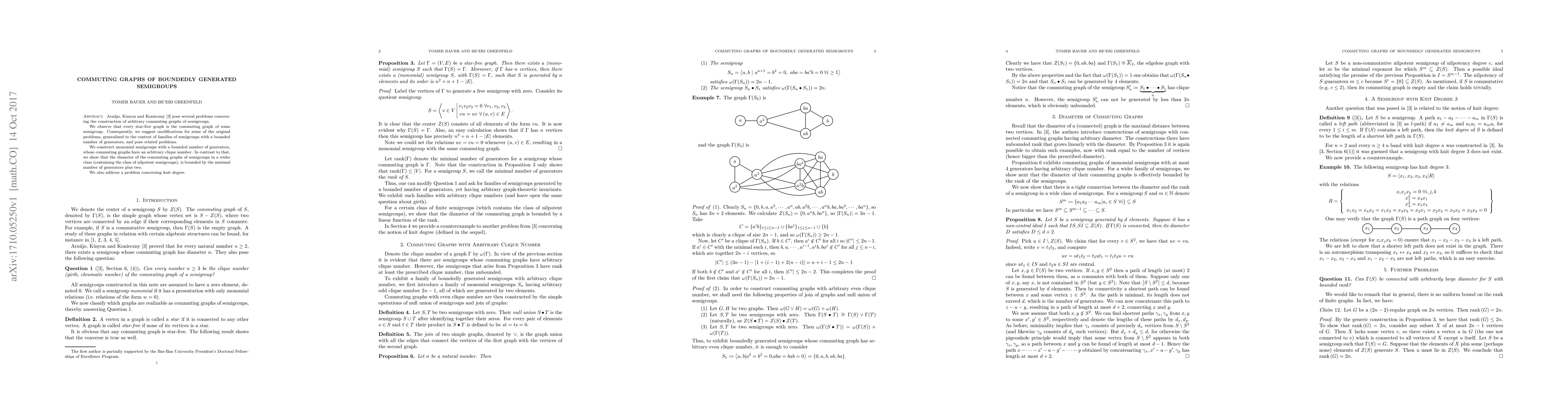 Ara\'ujo, Kinyon and Konieczny (2011) pose several problems concerning the construction of arbitrary commuting graphs of semigroups. We observe that every star-free graph is the commuting graph of some semigroup. Consequently, we suggest modifications for some of the original problems, generalized to the context of families of semigroups with a bounded number of generators, and pose related problems. We construct monomial semigroups with a bounded number of generators, whose commuting graphs have an arbitrary clique number. In contrast to that, we show that the diameter of the commuting graphs of semigroups in a wider class (containing the class of nilpotent semigroups), is bounded by the minimal number of generators plus two. We also address a problem concerning knit degree.