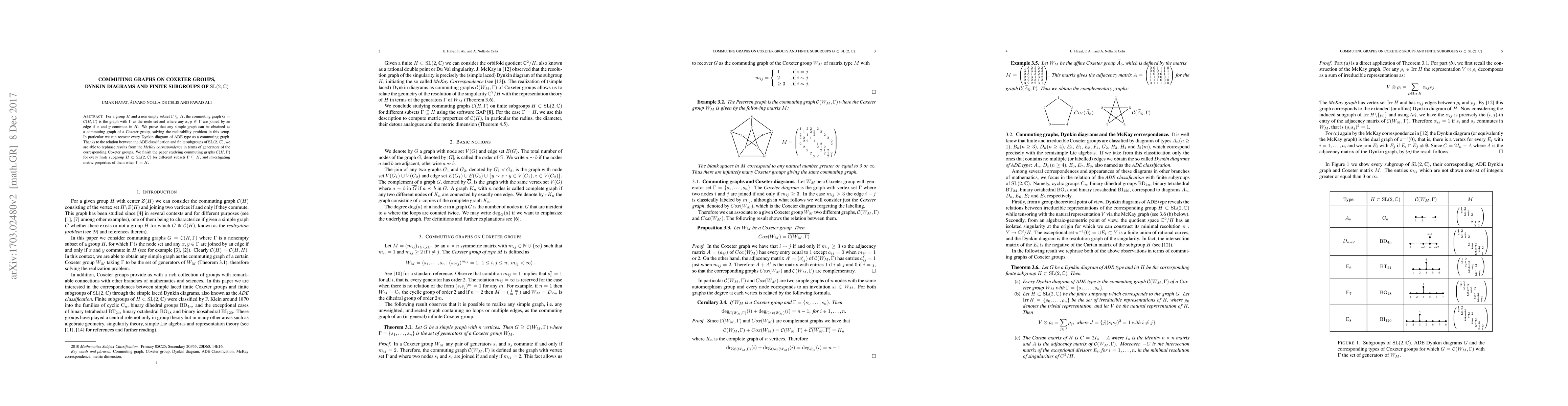 For a group $H$ and a non empty subset $\Gamma\subseteq H$, the commuting graph $G=\mathcal{C}(H,\Gamma)$ is the graph with $\Gamma$ as the node set and where any $x,y \in \Gamma$ are joined by an edge if $x$ and $y$ commute in $H$. We prove that any simple graph can be obtained as a commuting graph of a Coxeter group, solving the realizability problem in this setup. In particular we can recover every Dynkin diagram of ADE type as a commuting graph. Thanks to the relation between the ADE classification and finite subgroups of $\SL(2,\C)$, we are able to rephrase results from the {\em McKay correspondence} in terms of generators of the corresponding Coxeter groups. We finish the paper studying commuting graphs $\mathcal{C}(H,\Gamma)$ for every finite subgroup $H\subset\SL(2,\C)$ for different subsets $\Gamma\subseteq H$, and investigating metric properties of them when $\Gamma=H$.