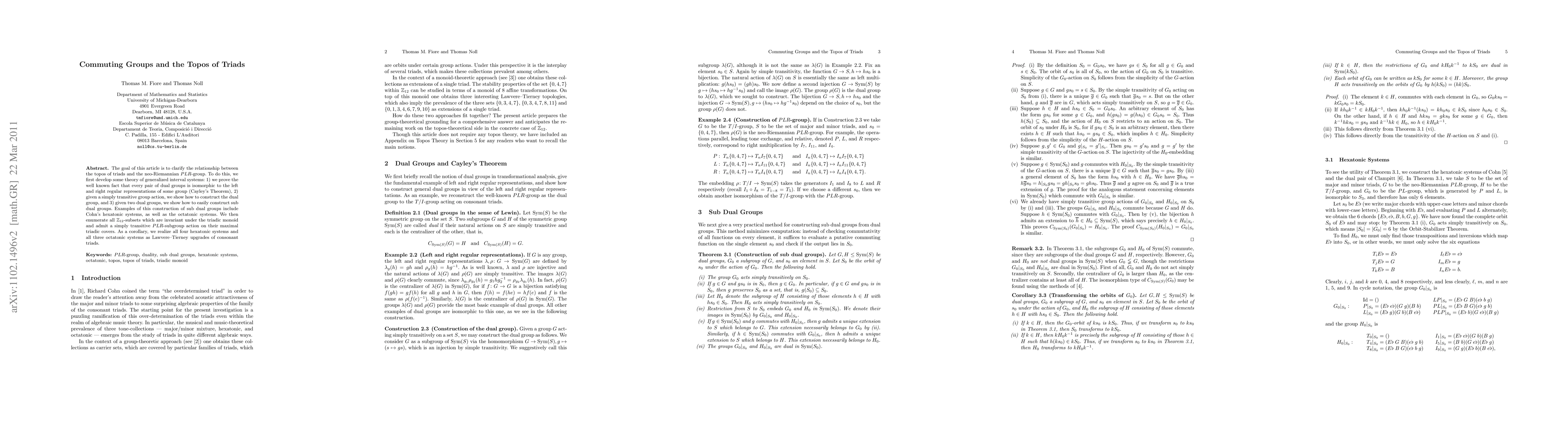 The goal of this article is to clarify the relationship between the topos of triads and the neo-Riemannian PLR-group. To do this, we first develop some theory of generalized interval systems: 1) we prove the well known fact that every pair of dual groups is isomorphic to the left and right regular representations of some group (Cayley's Theorem), 2) given a simply transitive group action, we show how to construct the dual group, and 3) given two dual groups, we show how to easily construct sub dual groups. Examples of this construction of sub dual groups include Cohn's hexatonic systems, as well as the octatonic systems. We then enumerate all Z_{12}-subsets which are invariant under the triadic monoid and admit a simply transitive PLR-subgroup action on their maximal triadic covers. As a corollary, we realize all four hexatonic systems and all three octatonic systems as Lawvere--Tierney upgrades of consonant triads.