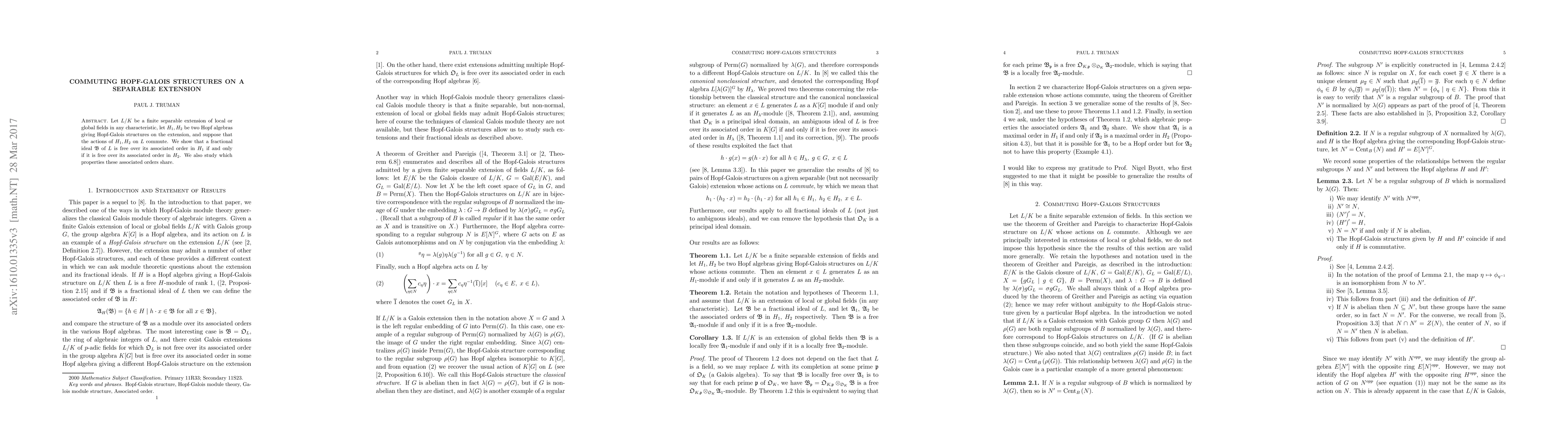 Let $ L/K $ be a finite separable extension of local or global fields in any characteristic, let $ H_{1}, H_{2} $ be two Hopf algebras giving Hopf-Galois structures on the extension, and suppose that the actions of $ H_{1}, H_{2} $ on $ L $ commute. We show that a fractional ideal $ {\mathfrak B} $ of $ L $ is free over its associated order in $ H_{1} $ if and only if it is free over its associated order in $ H_{2} $. We also study which properties these associated orders share.