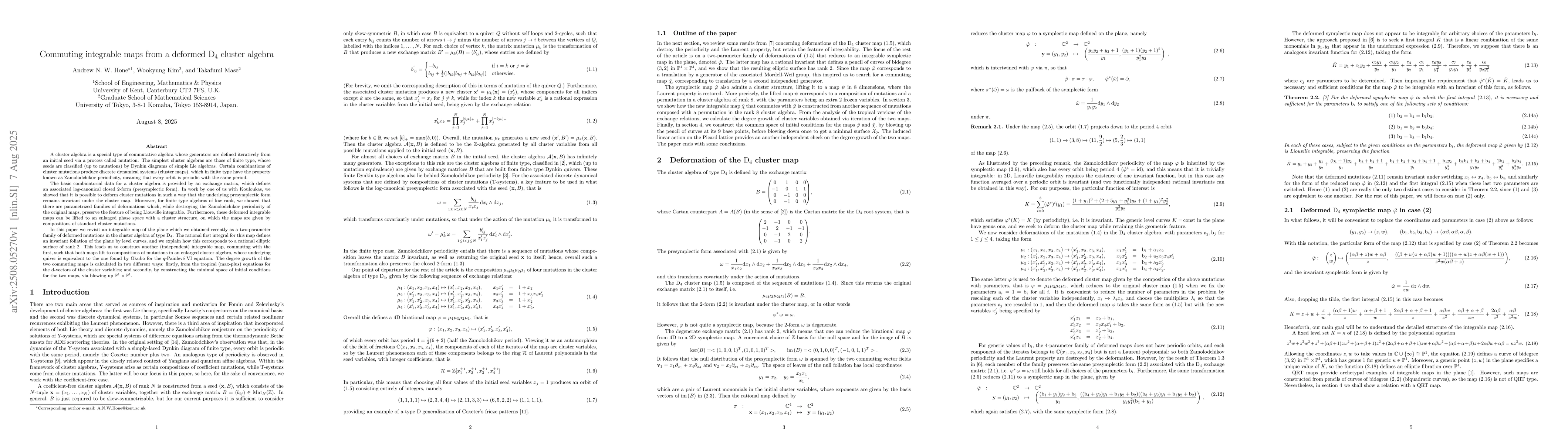 In this paper we revisit an integrable map of the plane which we obtained recently as a two-parameter family of deformed mutations in the cluster algebra of type D$_4$. The rational first integral for this map defines an invariant foliation of the plane by level curves, and we explain how this corresponds to a rational elliptic surface of rank 2. This leads us to construct another (independent) integrable map, commuting with the first, such that both maps lift to compositions of mutations in an enlarged cluster algebra, whose underlying quiver is equivalent to the one found by Okubo for the $q$-Painlev\'e VI equation. The degree growth of the two commuting maps is calculated in two different ways: firstly, from the tropical (max-plus) equations for the d-vectors of the cluster variables; and secondly, by constructing the minimal space of initial conditions for the two maps, via blowing up $\mathbb{P}^1 \times \mathbb{P}^1$.