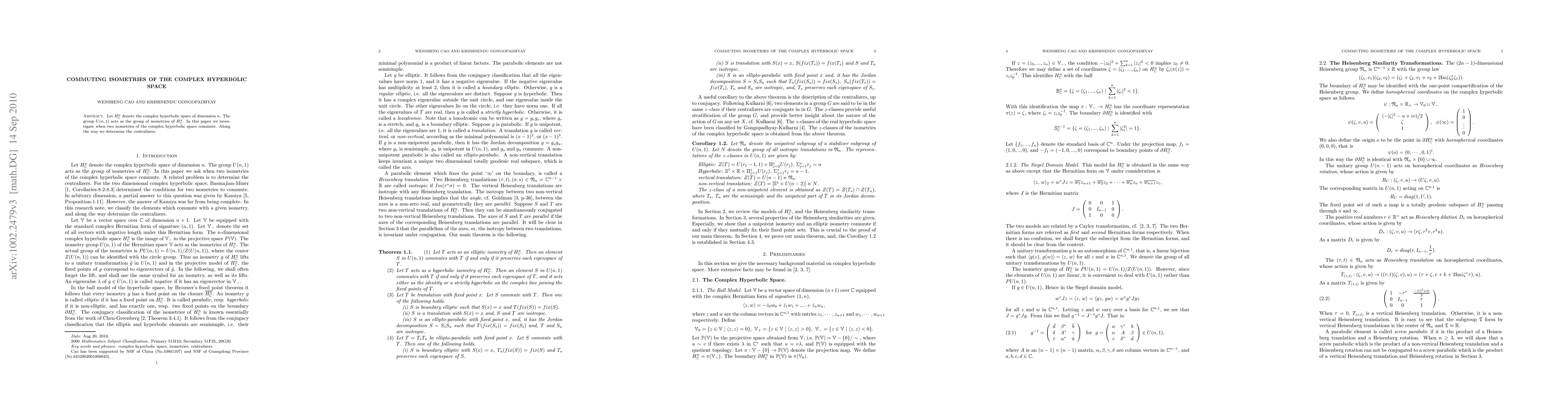 This paper examines the commuting properties of isometries in the complex hyperbolic space $H^n$ and identifies the centralizers of these isometries within the group $U(n,1)$. It determines when two isometries commute and provides insights into their centralizers.