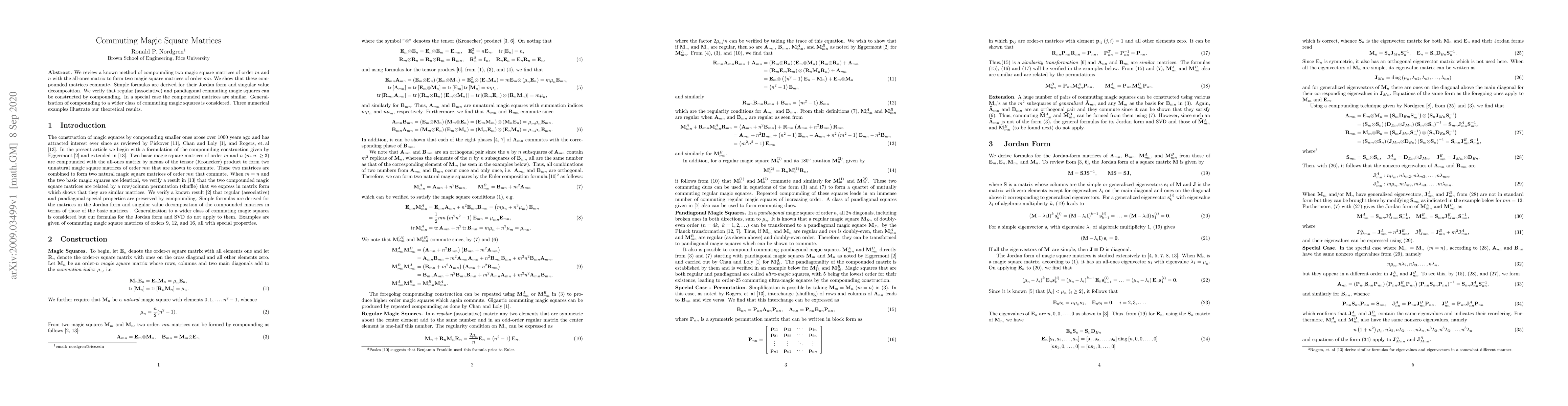 This paper reviews a method to create commuting magic square matrices by compounding two smaller magic square matrices with an all-ones matrix, deriving formulas for their Jordan form and singular value decomposition, and demonstrating the construction of regular and pandiagonal commuting magic squares through compounding.