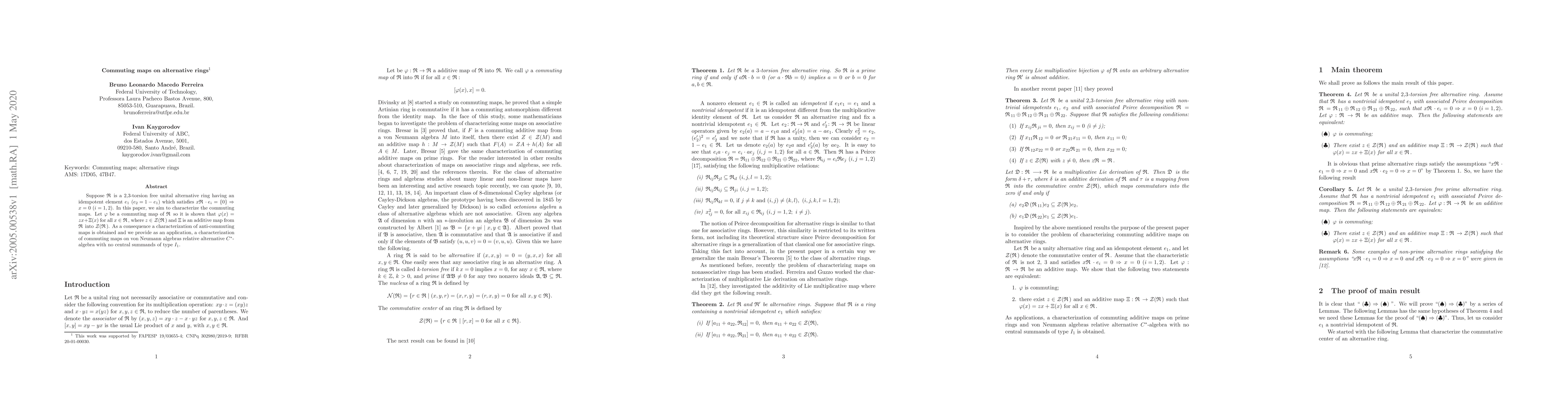 This paper characterizes commuting maps on a $2$,$3$-torsion free unital alternative ring $\mathfrak{R}$ with specific idempotent elements, showing they take the form $\varphi(x) = zx + \Xi(x)$ and also provides a characterization for anti-commuting maps, with an application to commuting maps in von Neumann algebras.