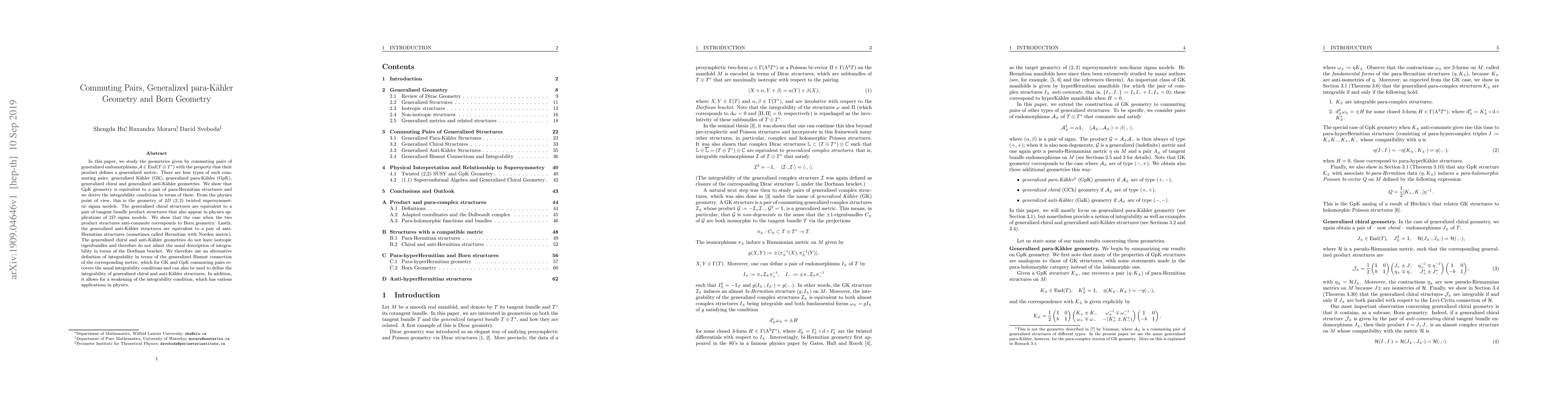 In this paper, we study the geometries given by commuting pairs of generalized endomorphisms ${\cal A} \in \text{End}(T\oplus T^*)$ with the property that their product defines a generalized metric. There are four types of such commuting pairs: generalized K\"ahler (GK), generalized para-K\"ahler (GpK), generalized chiral and generalized anti-K\"ahler geometries. We show that GpK geometry is equivalent to a pair of para-Hermitian structures and we derive the integrability conditions in terms of these. From the physics point of view, this is the geometry of $2D$ $(2,2)$ twisted supersymmetric sigma models. The generalized chiral structures are equivalent to a pair of tangent bundle product structures that also appear in physics applications of $2D$ sigma models. We show that the case when the two product structures anti-commute corresponds to Born geometry. Lastly, the generalized anti-K\"ahler structures are equivalent to a pair of anti-Hermitian structures (sometimes called Hermitian with Norden metric). The generalized chiral and anti-K\"ahler geometries do not have isotropic eigenbundles and therefore do not admit the usual description of integrability in terms of the Dorfman bracket. We therefore use an alternative definition of integrability in terms of the generalized Bismut connection of the corresponding metric, which for GK and GpK commuting pairs recovers the usual integrability conditions and can also be used to define the integrability of generalized chiral and anti-K\"ahler structures. In addition, it allows for a weakening of the integrability condition, which has various applications in physics.