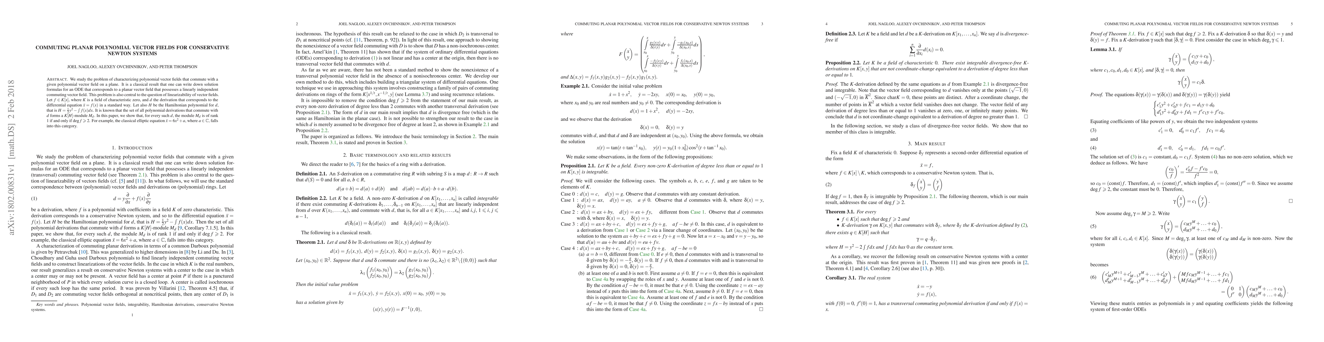 We study the problem of characterizing polynomial vector fields that commute with a given polynomial vector field on a plane. It is a classical result that one can write down solution formulas for an ODE that corresponds to a planar vector field that possesses a linearly independent commuting vector field. This problem is also central to the question of linearizability of vector fields. Let $f \in K[x]$, where $K$ is a field of characteristic zero, and $d$ the derivation that corresponds to the differential equation $\ddot x = f(x)$ in a standard way. Let also $H$ be the Hamiltonian polynomial for $d$, that is $H=\frac{1}{2}y^2-\int{f(x)dx}$. It is known that the set of all polynomial derivations that commute with $d$ forms a $K[H]$-module $M_d$. In this paper, we show that, for every such $d$, the module $M_d$ is of rank $1$ if and only if $\text{deg}\; f\geqslant 2$. For example, the classical elliptic equation $\ddot x = 6x^2+a$, where $a \in \mathbb{C}$, falls into this category.