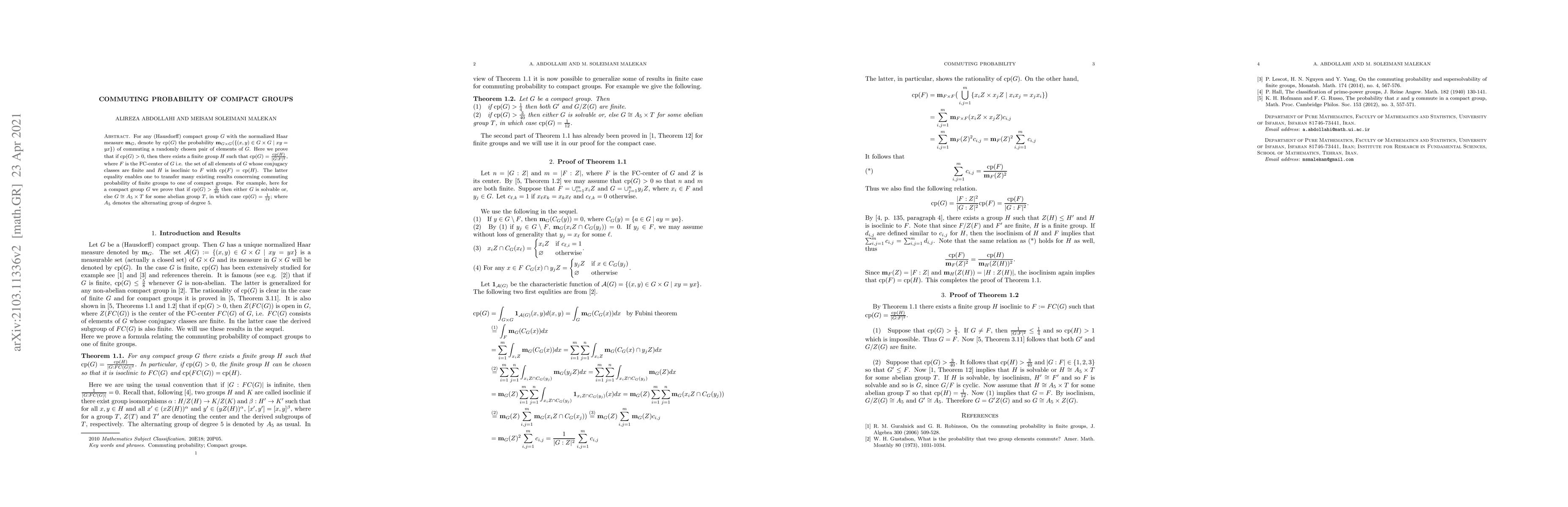 This paper investigates the commuting probability ${\rm cp}(G)$ of compact groups, proving that if ${\rm cp}(G)>0$, then there exists a finite group $H$ such that ${\rm cp}(G)$ relates to $H$ through the FC-center of $G$. It also establishes that if ${\rm cp}(G)>\frac{3}{40}$, then $G$ is either solvable or isomorphic to $A_5 \times T$ for some abelian group $T$, with ${\rm cp}(G)=\frac{1}{12}$.