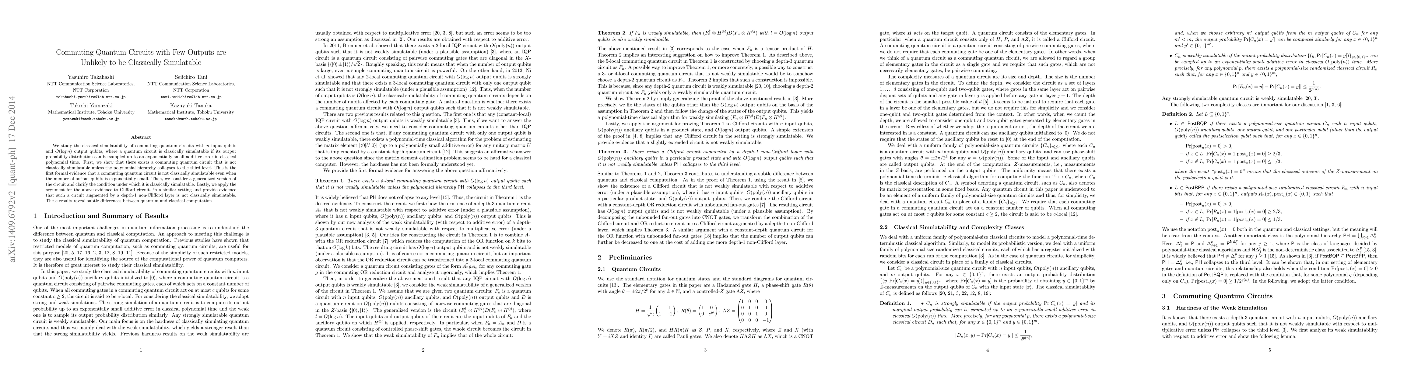 This paper demonstrates that commuting quantum circuits with a small number of output qubits (O(log n)) are unlikely to be classically simulatable, providing evidence that such circuits remain quantum even with exponentially fewer outputs. It also shows that unless the polynomial hierarchy collapses, these circuits cannot be efficiently simulated classically, highlighting fundamental differences between quantum and classical computation.