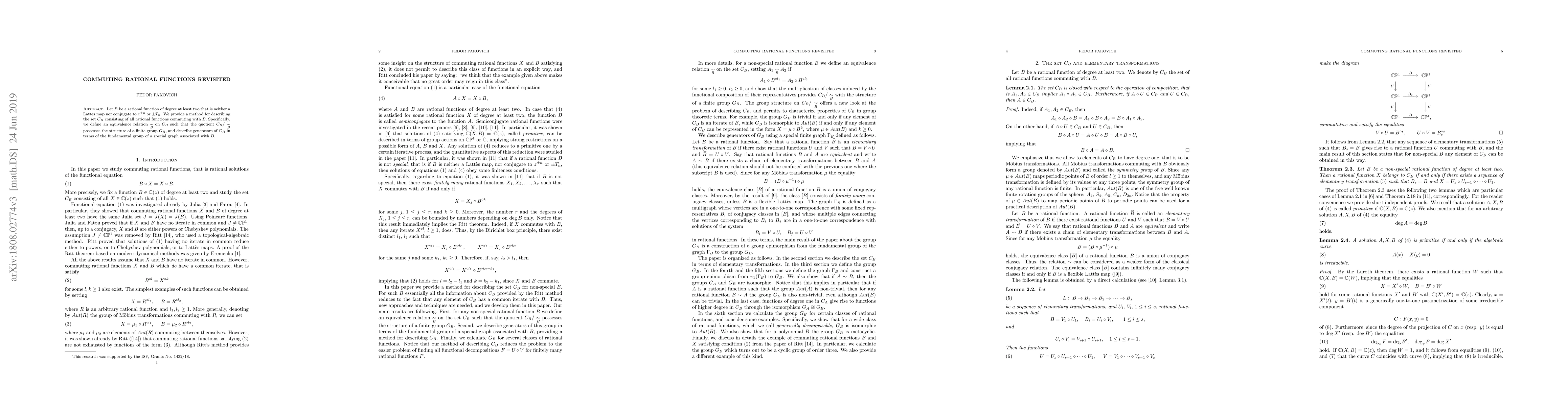 Let $B$ be a rational function of degree at least two that is neither a Latt\`es map nor conjugate to $z^{\pm n}$ or $\pm T_n$. We provide a method for describing the set $C_B$ consisting of all rational functions commuting with $B.$ Specifically, we define an equivalence relation $\underset{B}{\sim}$ on $ C_B$ such that the quotient $ C_B/\underset{B}{\sim}$ possesses the structure of a finite group $G_B$, and describe generators of $G_B$ in terms of the fundamental group of a special graph associated with $B$.