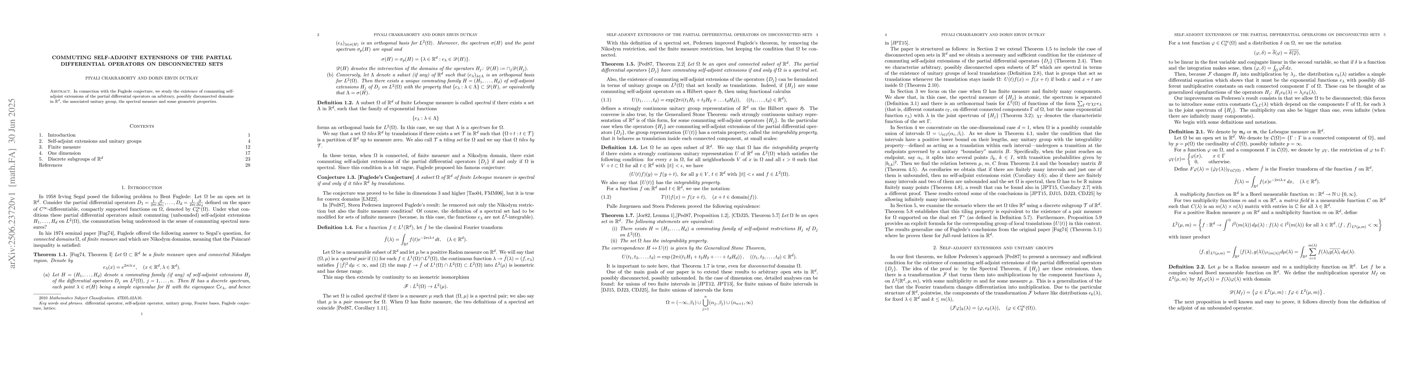In connection with the Fuglede conjecture, we study the existence of commuting self-adjoint extensions of the partial differential operators on arbitrary, possibly disconnected domains in $\br^d$, the associated unitary group, the spectral measure and some geometric properties.