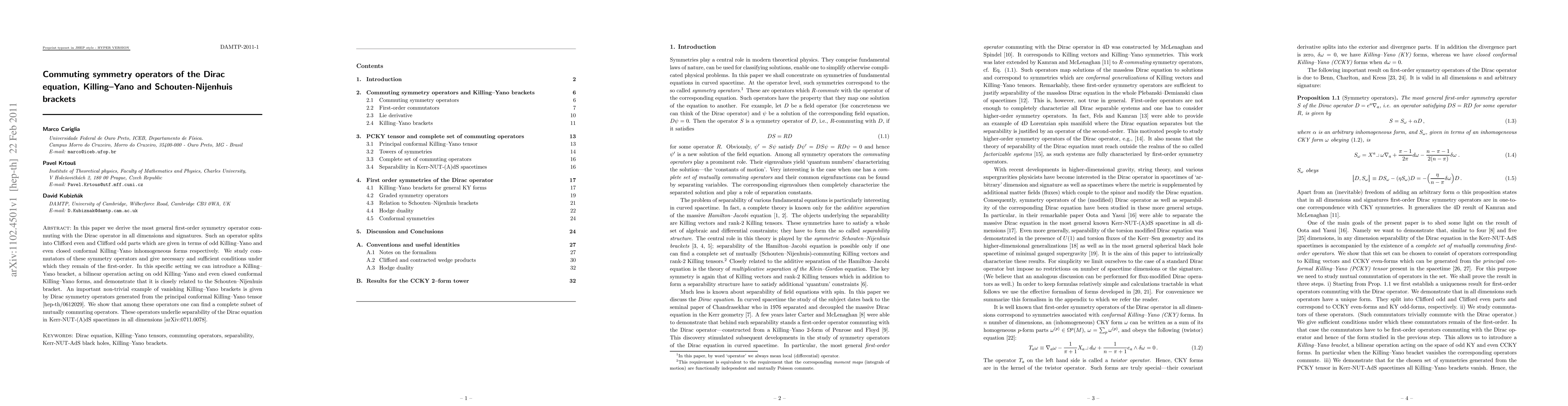 In this paper we derive the most general first-order symmetry operator commuting with the Dirac operator in all dimensions and signatures. Such an operator splits into Clifford even and Clifford odd parts which are given in terms of odd Killing-Yano and even closed conformal Killing-Yano inhomogeneous forms respectively. We study commutators of these symmetry operators and give necessary and sufficient conditions under which they remain of the first-order. In this specific setting we can introduce a Killing-Yano bracket, a bilinear operation acting on odd Killing-Yano and even closed conformal Killing-Yano forms, and demonstrate that it is closely related to the Schouten-Nijenhuis bracket. An important non-trivial example of vanishing Killing-Yano brackets is given by Dirac symmetry operators generated from the principal conformal Killing-Yano tensor [hep-th/0612029]. We show that among these operators one can find a complete subset of mutually commuting operators. These operators underlie separability of the Dirac equation in Kerr-NUT-(A)dS spacetimes in all dimensions [arXiv:0711.0078].
