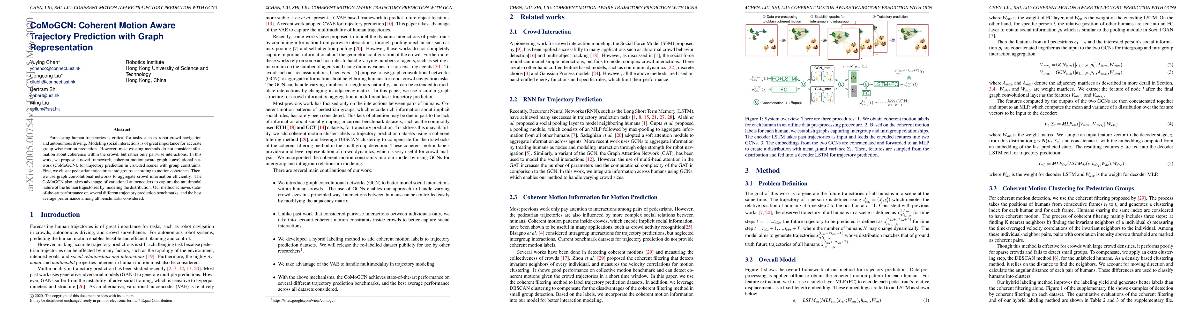This paper proposes CoMoGCN, a graph convolutional network that predicts human trajectories in crowded scenes by clustering pedestrians into groups based on motion coherence and capturing multimodal nature with variational autoencoders.