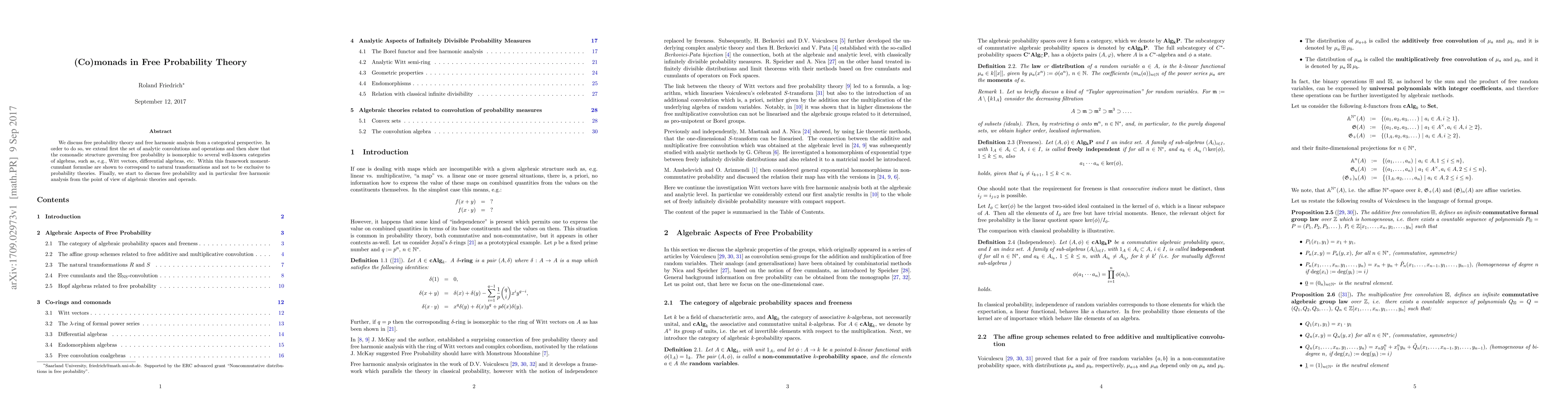 We discuss free probability theory and free harmonic analysis from a categorical perspective. In order to do so, we extend first the set of analytic convolutions and operations and then show that the comonadic structure governing free probability is isomorphic to several well-known categories of algebras, such as, e.g., Witt vectors, differential algebras, etc. Within this framework moment-cumulant formulae are shown to correspond to natural transformations and not to be exclusive to probability theories. Finally, we start to discuss free probability and in particular free harmonic analysis from the point of view of algebraic theories and operads.