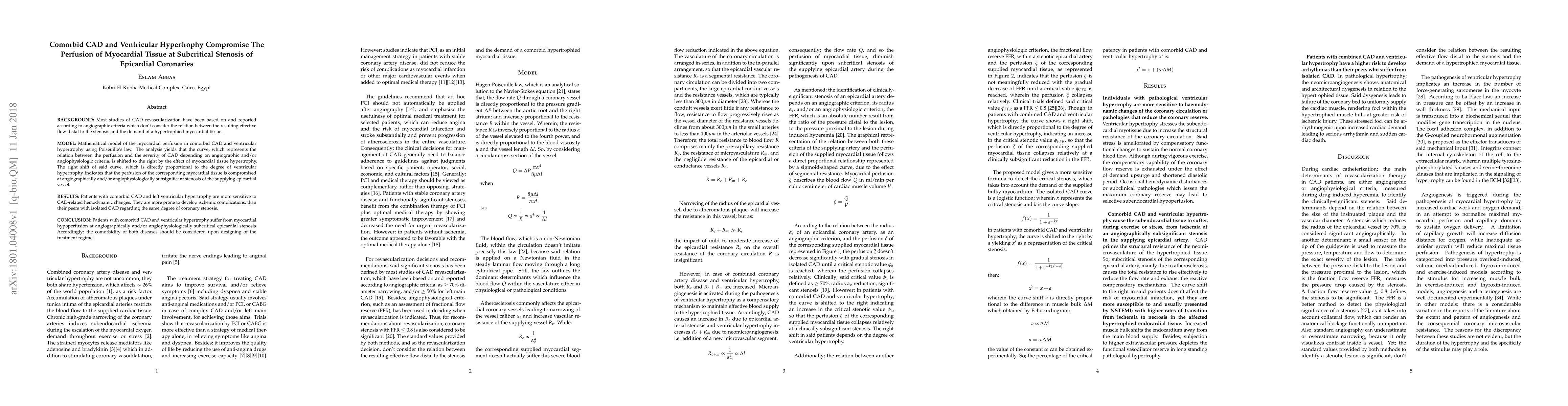 BACKGROUND: Most studies of CAD revascularization have been based on and reported according to angiographic criteria which don't consider the relation between the resulting effective flow distal to the stenosis and the demand of a hypertrophied myocardial tissue. MODEL: Mathematical model of the myocardial perfusion in comorbid CAD and ventricular hypertrophy using Poiseuille's law. The analysis yields that the curve, which represents the relation between the perfusion and the severity of CAD depending on angiographic and/or angiophysiologic criteria, is shifted to the right by the effect of myocardial tissue hypertrophy. The right shift of said curve, which is directly proportional to the degree of ventricular hypertrophy, indicates that the perfusion of the corresponding myocardial tissue is compromised at angiographically and/or angiophysiologically subsignificant stenosis of the supplying epicardial vessel. RESULTS: Patients with comorbid CAD and left ventricular hypertrophy are more sensitive to CAD-related hemodynamic changes. They are more prone to develop ischemic complications, than their peers with isolated CAD regarding the same degree of coronary stenosis. CONCLUSION: Patients with comorbid CAD and ventricular hypertrophy suffer from myocardial hypoperfusion at angiographically and/or angiophysiologically subcritical epicardial stenosis. Accordingly; the comorbidity of both diseases should be considered upon designing of the treatment regime.