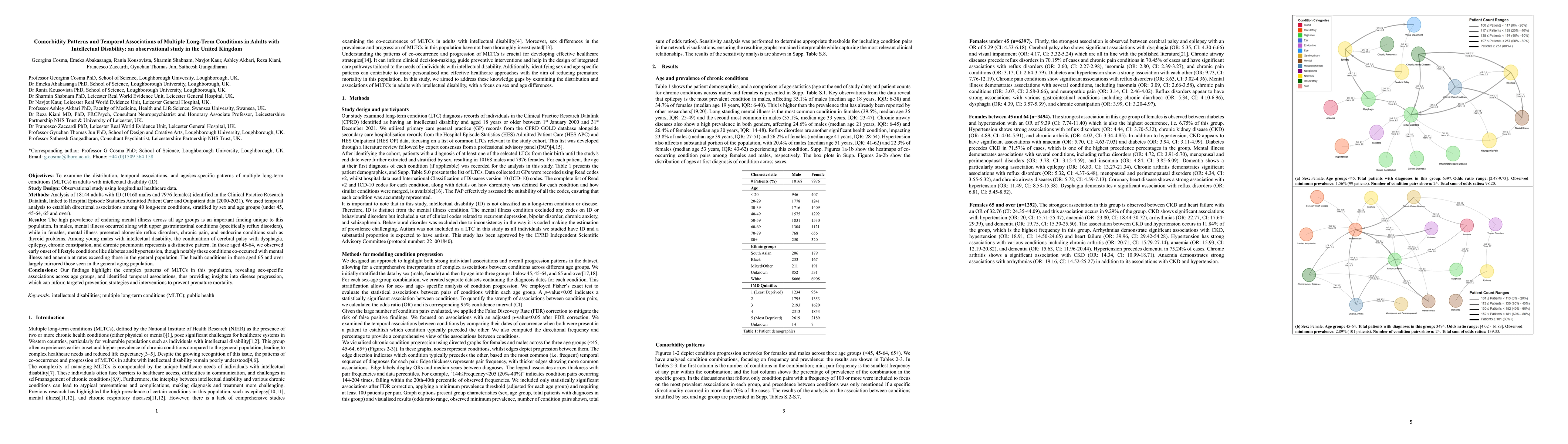 This observational study in the UK examines the distribution and temporal associations of multiple long-term conditions in adults with intellectual disability, revealing distinct patterns by sex and age, with mental illness often co-occurring with specific physical conditions, highlighting the need for targeted prevention strategies.
