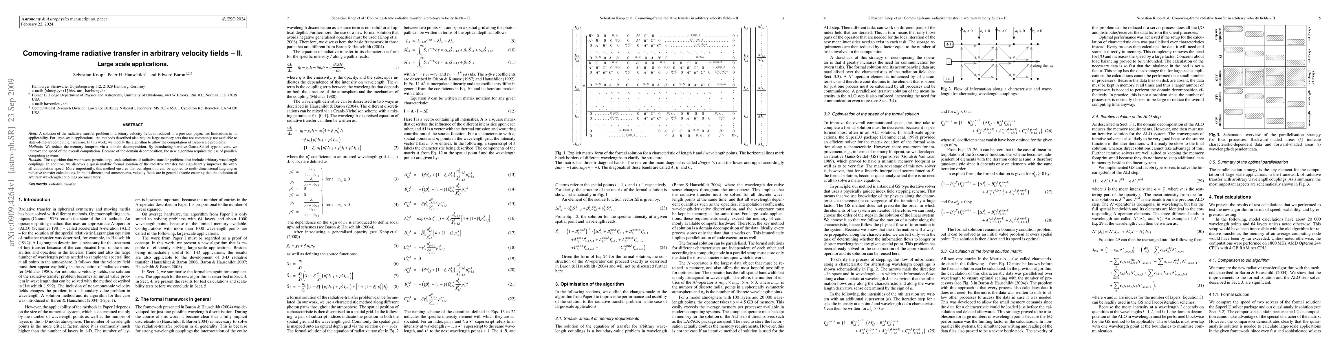 This paper presents an improved algorithm for solving large-scale radiative-transfer problems in arbitrary velocity fields, reducing memory requirements through domain decomposition and enhancing computational speed with iterative solvers and parallel computing. The new method also includes a quasi-analytic solution to improve efficiency and supports multi-dimensional Lagrangian calculations.