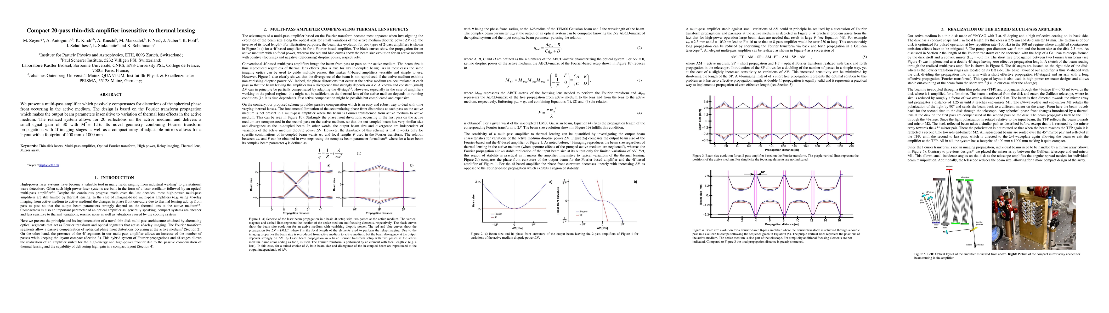A 20-pass amplifier with a compact design compensates for thermal lensing distortions using Fourier transform propagation, delivering small signal gain of 30 and insensitivity to thermal effects.