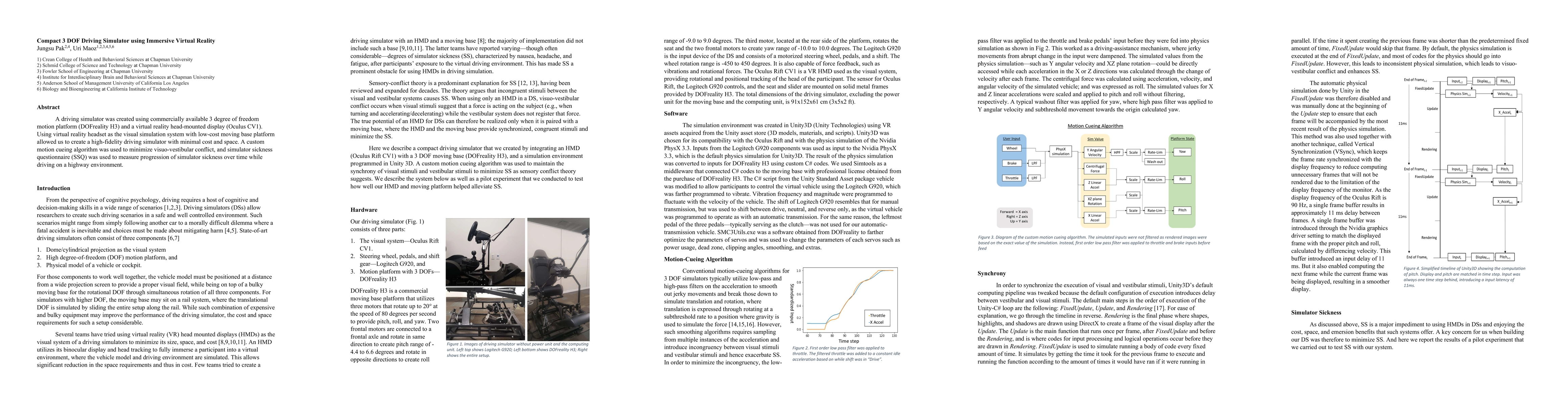 This study developed a cost-effective, compact 3 DOF driving simulator using a motion platform and VR headset, employing a custom motion cueing algorithm to reduce simulator sickness, which was assessed using the SSQ during highway driving simulations.