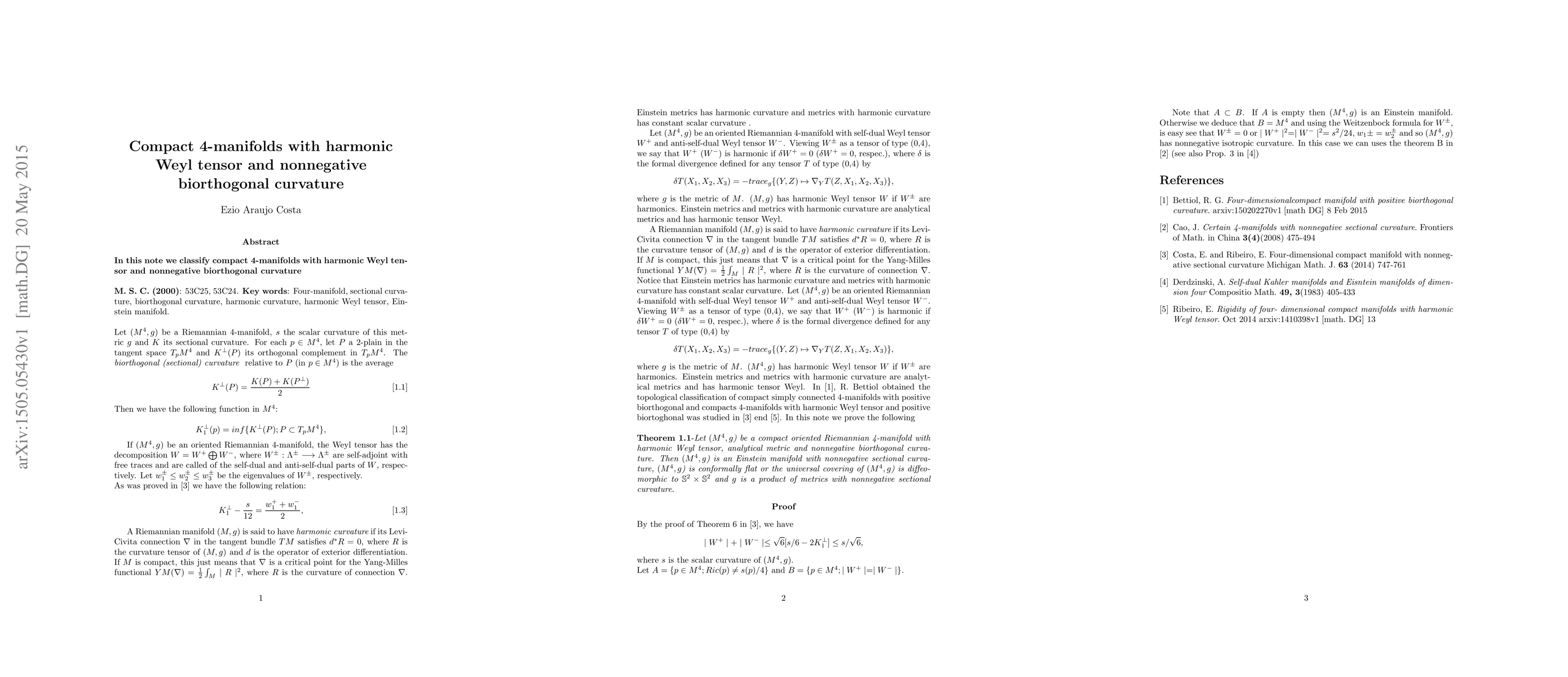 Summary: This paper classifies compact 4-manifolds that possess a harmonic Weyl tensor and nonnegative biorthogonal curvature, contributing to the understanding of geometric structures in four dimensions. The classification provides significant insights into the interplay between curvature and geometric properties of these manifolds.