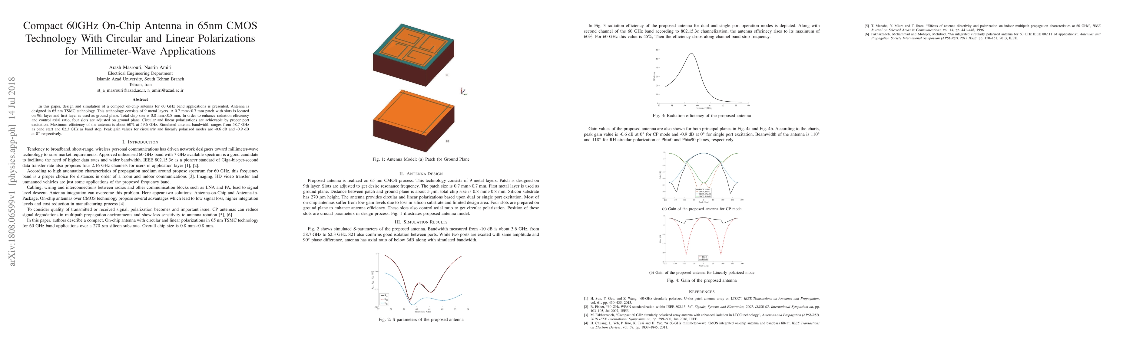 In this paper, design and simulation of a compact on-chip antenna for 60 GHz band applications is presented. Antenna is designed in 65nm TSMC technology. This technology consists of 9 metal layers. A 0.7 mm * 0.7 mm patch with slots is located on 9th layer and first layer is used as ground plane. Total chip size is 0.8 mm * 0.8 mm. In order to enhance radiation efficiency and control axial ratio, four slots are adjusted on ground plane. Circular and linear polarizations are achievable by proper port excitation. Maximum efficiency of the antenna is about 60% at 59.6 GHz. Simulated antenna bandwidth ranges from 58.7 GHz as band start and 62.3 GHz as band stop. Peak gain values for circularly and linearly polarized modes are -0.6 dB and -0.9 dB at 0 respectively.