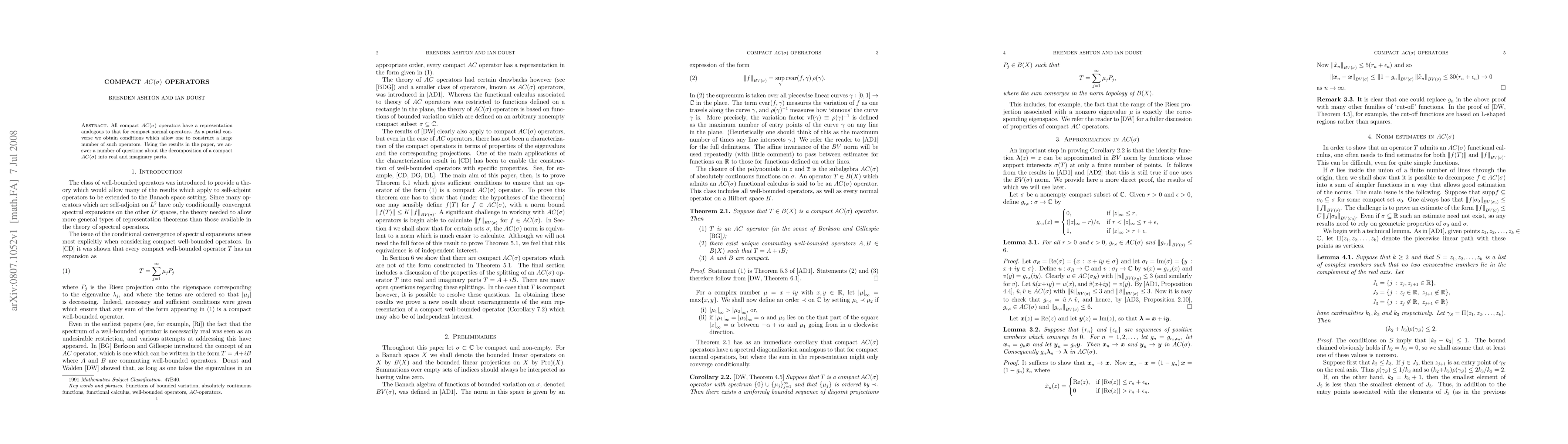 This paper explores the representation of compact $AC(\sigma)$ operators, showing they can be expressed similarly to compact normal operators. It also provides conditions for constructing numerous such operators and addresses questions regarding the decomposition of these operators into their real and imaginary parts.