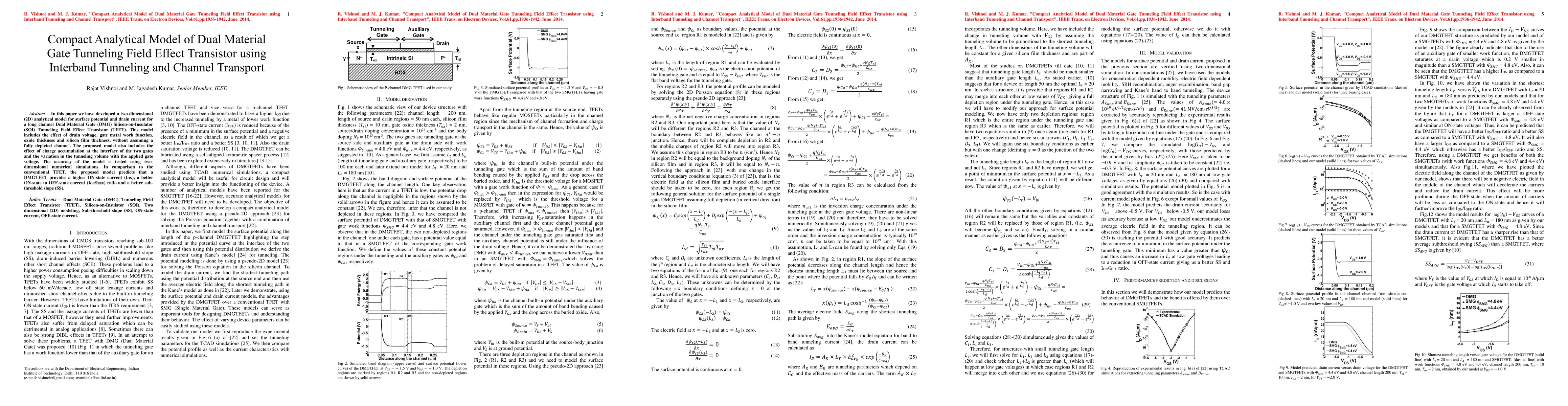 This paper presents a 2D analytical model for a long-channel Dual Material Gate Tunneling Field Effect Transistor (DMGTFET) that considers interband tunneling and channel transport. The model predicts improved ON-state current, ON/OFF current ratio, and sub-threshold slope compared to conventional TFETs, validated by 2D numerical simulations.