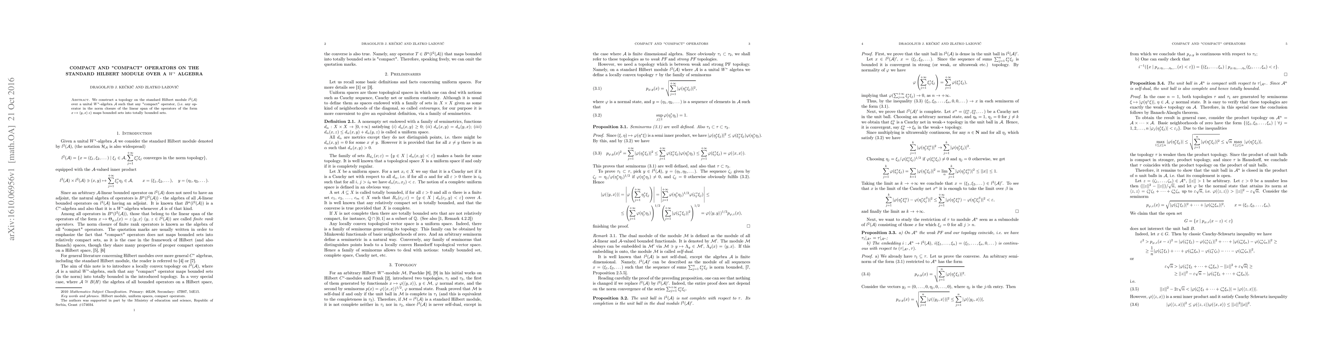 We construct a topology on the standard Hilbert module $l^2(\mathcal A)$ over