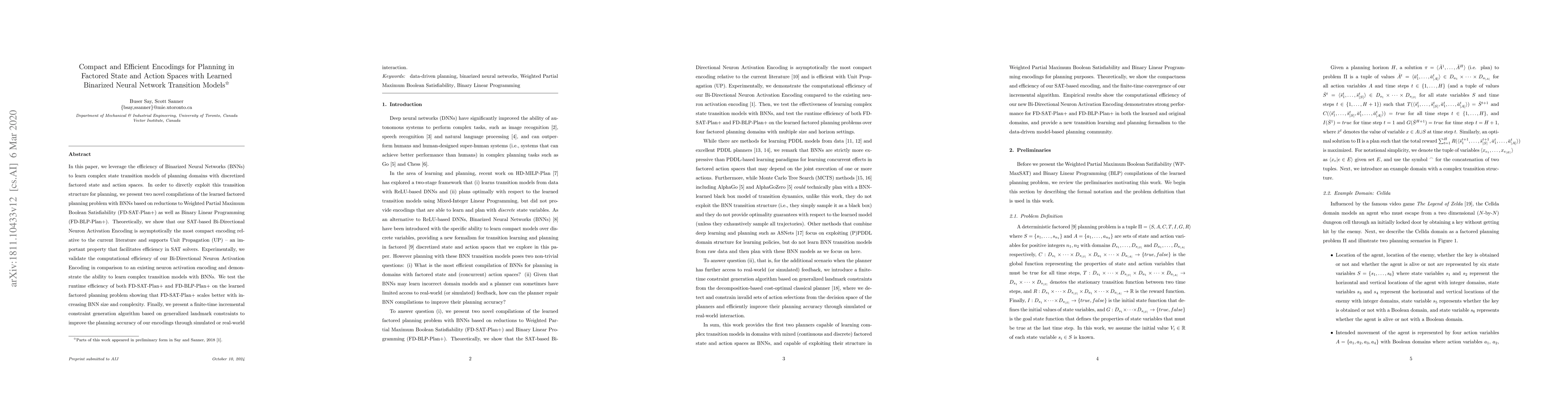 This research introduces Binarized Neural Networks (BNNs) to learn complex state transition models for planning in factored state and action spaces. It presents two novel compilations, FD-SAT-Plan+ and FD-BLP-Plan+, for the factored planning problem. The Bi-Directional Neuron Activation Encoding is shown to be compact and efficient, supporting Unit Propagation. Experiments validate the efficiency and accuracy of these methods in learning and planning with BNNs.