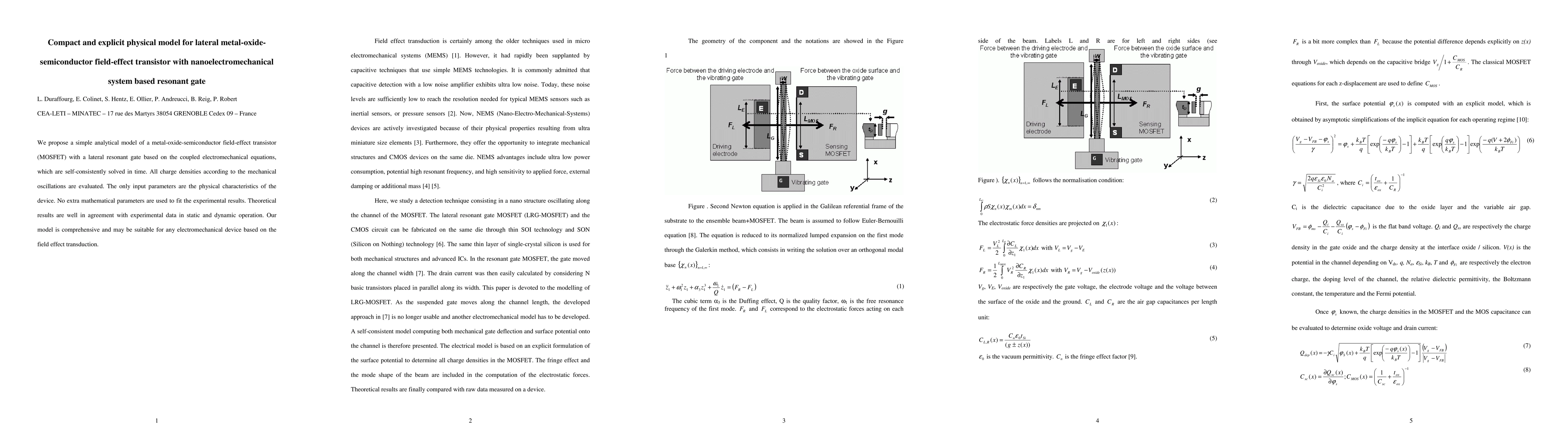 We propose a simple analytical model of a metal-oxide-semiconductor field-effect transistor with a lateral resonant gate based on the coupled electromechanical equations, which are self-consistently solved in time. All charge densities according to the mechanical oscillations are evaluated. The only input parameters are the physical characteristics of the device. No extra mathematical parameters are used to fit the experimental results. Theoretical results are in good agreement with the experimental data in static and dynamic operation. Our model is comprehensive and may be suitable for any electromechanical device based on the field-effect transduction.