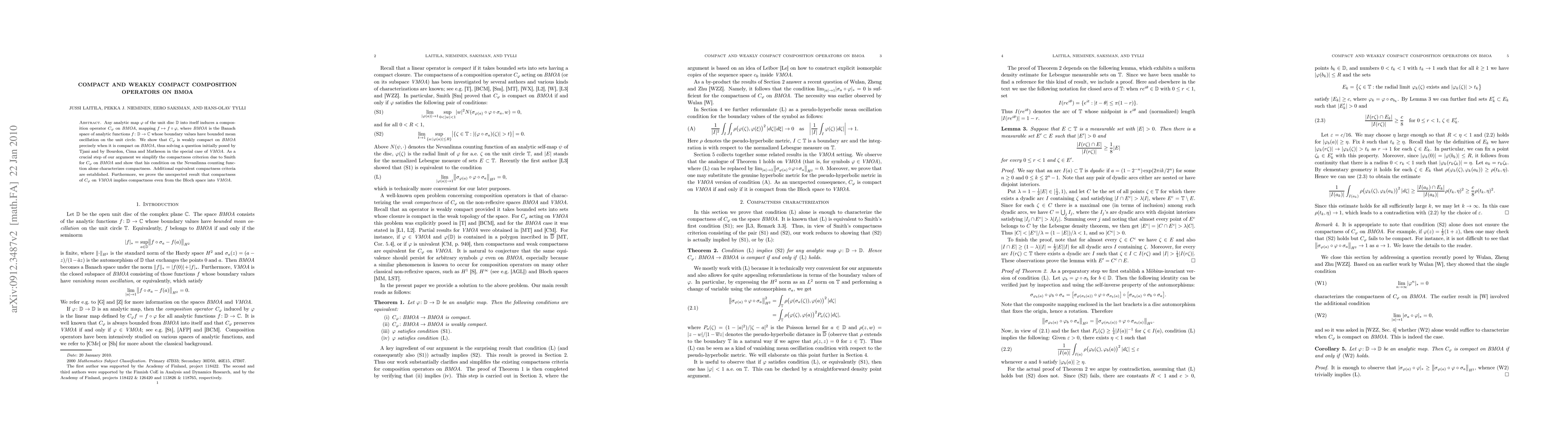 This paper demonstrates that composition operators on BMOA are weakly compact if and only if they are compact, and it simplifies Smith's criterion for compactness, showing that the Nevanlinna counting function condition alone is sufficient. Equivalent compactness criteria for composition operators on both BMOA and VMOA are also derived.