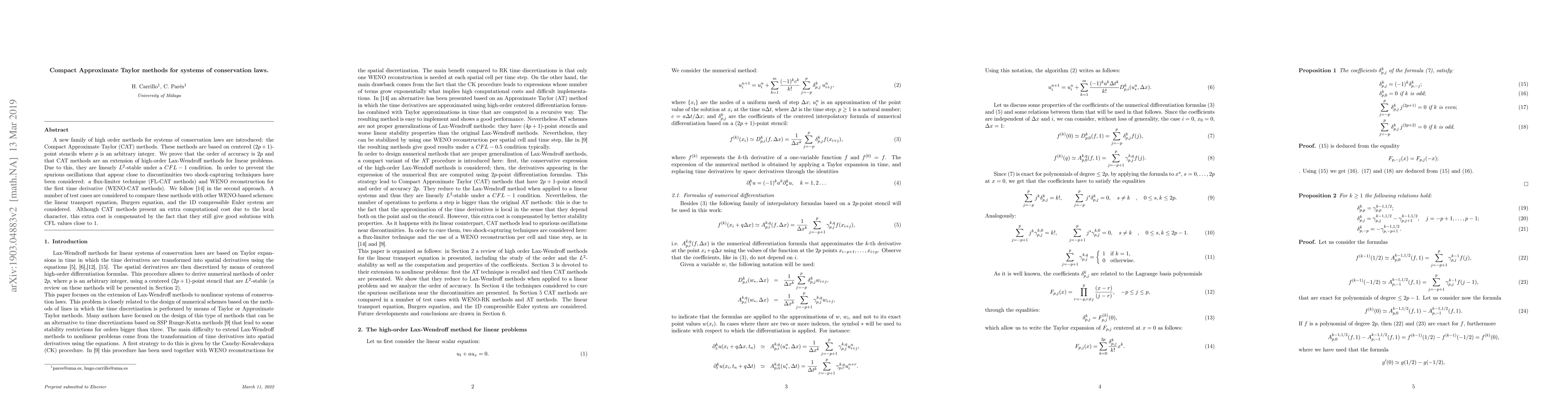 A new family of high-order Compact Approximate Taylor (CAT) methods for solving systems of conservation laws have been introduced, offering improved accuracy and stability with shock-capturing techniques.