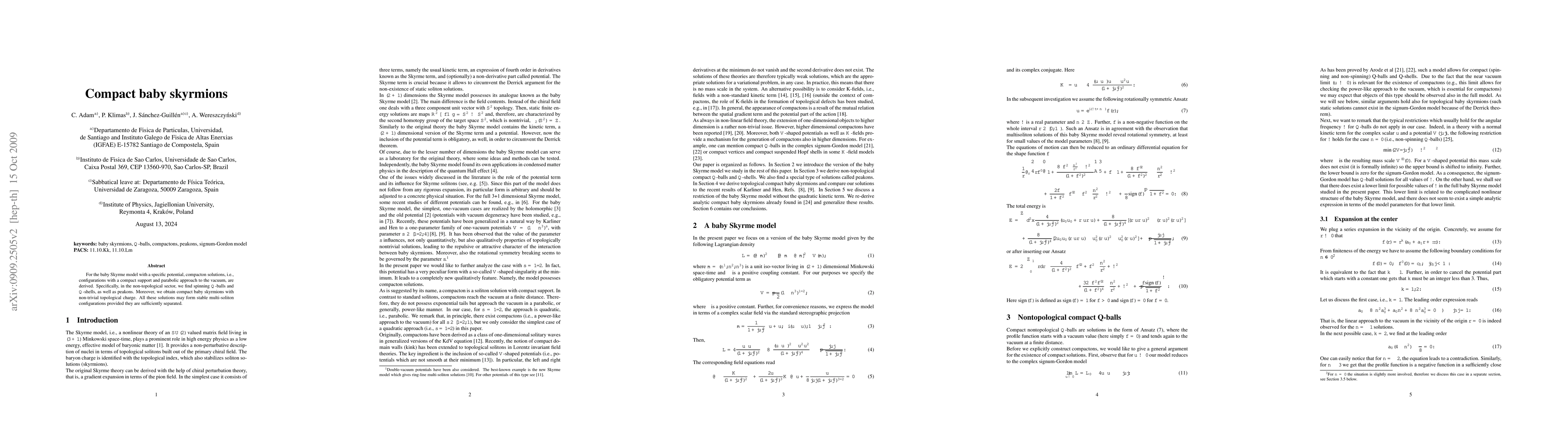 For the baby Skyrme model with a specific potential, compacton solutions, i.e., configurations with a compact support and parabolic approach to the vacuum, are derived. Specifically, in the non-topological sector, we find spinning Q-balls and Q-shells, as well as peakons. Moreover, we obtain compact baby skyrmions with non-trivial topological charge. All these solutions may form stable multi-soliton configurations provided they are sufficiently separated.