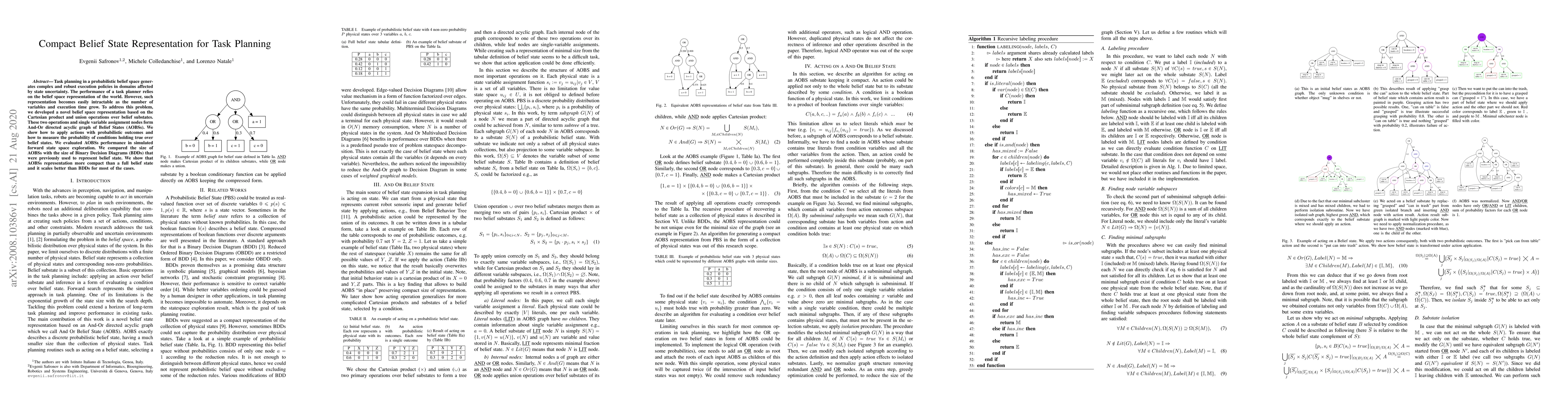 Task planning in a probabilistic belief state domains allows generating complex and robust execution policies in those domains affected by state uncertainty. The performance of a task planner relies on the belief state representation. However, current belief state representation becomes easily intractable as the number of variables and execution time grows. To address this problem, we developed a novel belief state representation based on cartesian product and union operations over belief substates. These two operations and single variable assignment nodes form And-Or directed acyclic graph of Belief State (AOBS). We show how to apply actions with probabilistic outcomes and measure the probability of conditions holding over belief state. We evaluated AOBS performance in simulated forward state space exploration. We compared the size of AOBS with the size of Binary Decision Diagrams (BDD) that were previously used to represent belief state. We show that AOBS representation is not only much more compact than a full belief state but it also scales better than BDD for most of the cases.
