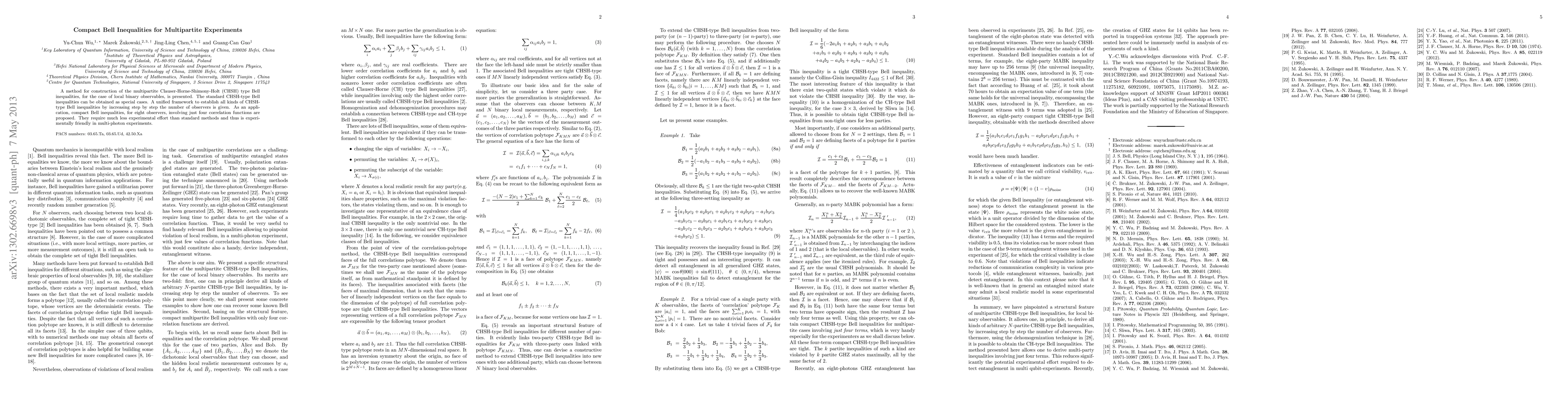 This paper presents a method for constructing multipartite CHSH-type Bell inequalities for local binary observables, offering a unified framework for increasing the number of observers. It proposes compact Bell inequalities for eight observers requiring only four correlation functions, significantly reducing experimental effort.