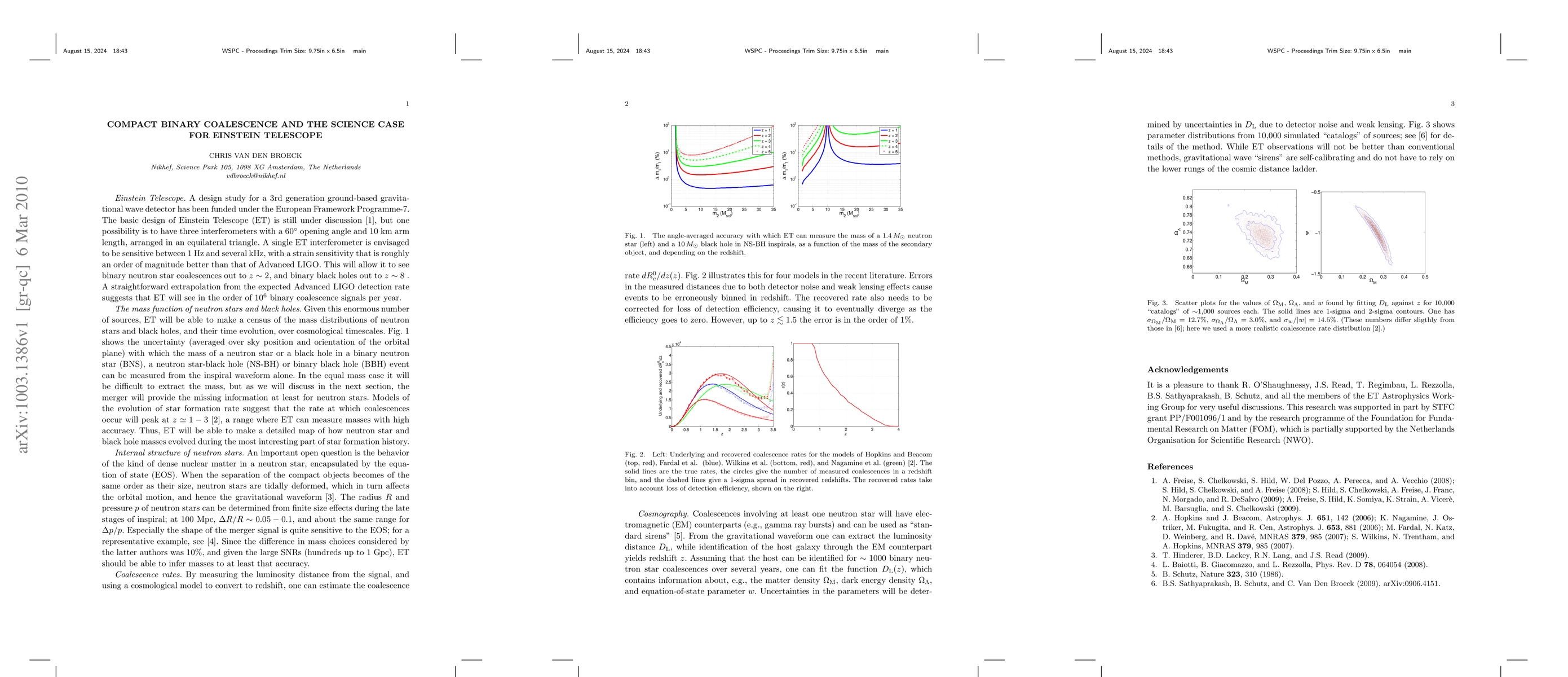 The Einstein Telescope is a proposed third-generation gravitational wave observatory designed to observe compact binary coalescences, providing unprecedented insights into neutron star and black hole masses, internal structures, coalescence rates, and the Universe's geometry and dynamics. Its capabilities promise significant advancements in astrophysics and cosmology.