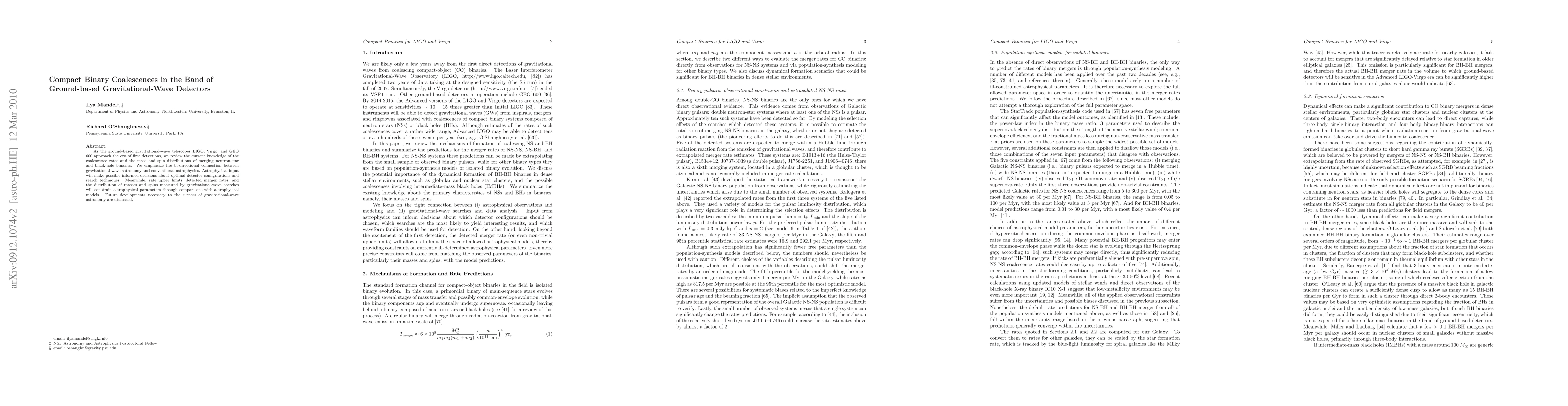 This paper reviews current knowledge of neutron-star and black-hole binary coalescence rates, mass, and spin distributions detected by LIGO, Virgo, and GEO 600. It highlights the interplay between gravitational-wave astronomy and conventional astrophysics to optimize detector configurations and search techniques, while also discussing future developments crucial for the field's success.