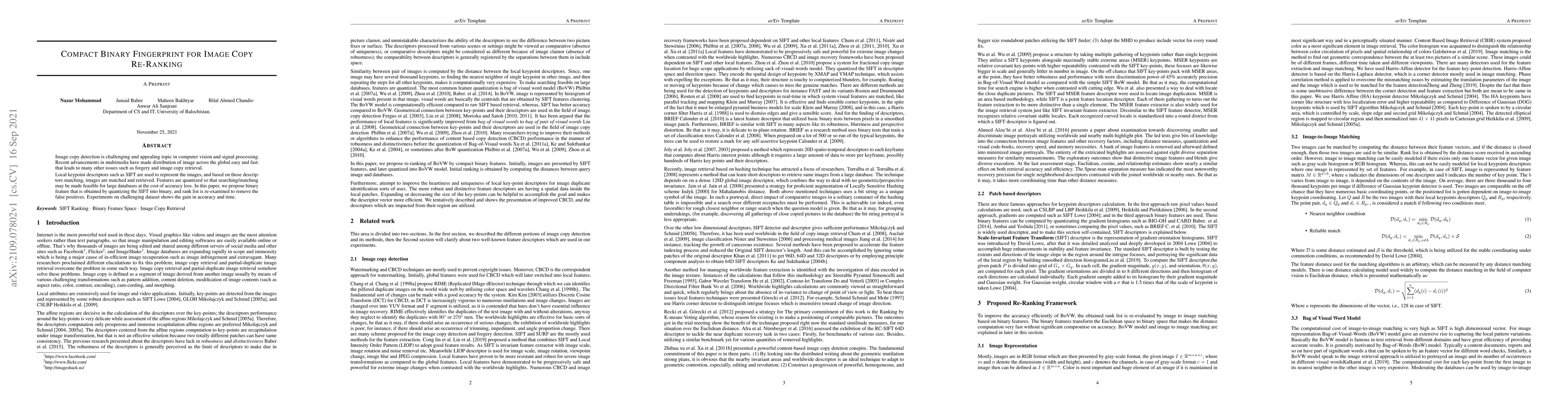 This paper proposes a compact binary fingerprint derived from quantized SIFT descriptors for efficient image copy detection. The method enhances accuracy and speed in re-ranking image matches, demonstrating improved performance over traditional local keypoint descriptors in large databases.