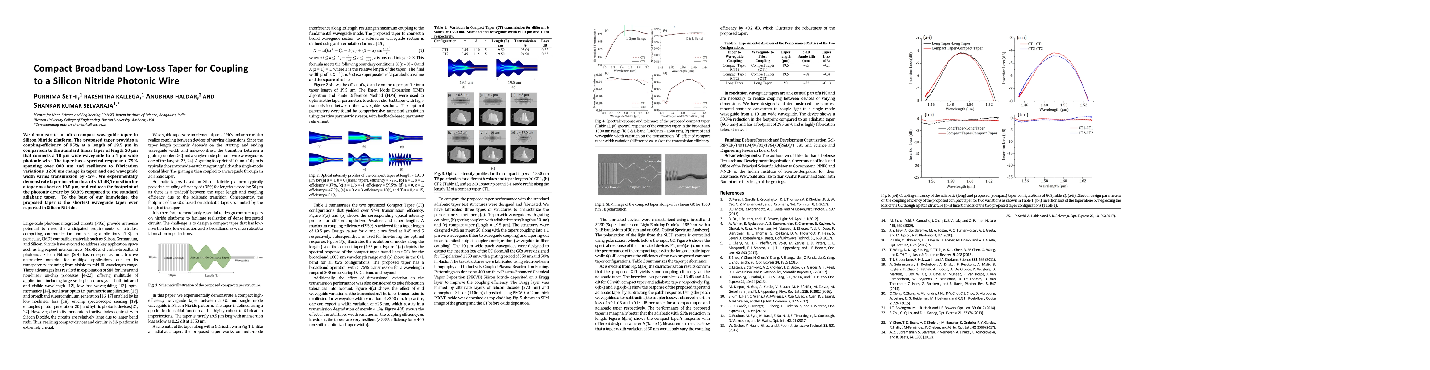 This research paper presents a compact, ultra-short waveguide taper in Silicon Nitride that achieves 95% coupling efficiency over a broad spectral range, significantly reducing device footprint and insertion loss compared to standard linear tapers. The proposed taper is the shortest ever reported in Silicon Nitride, demonstrating resilience to fabrication variations.