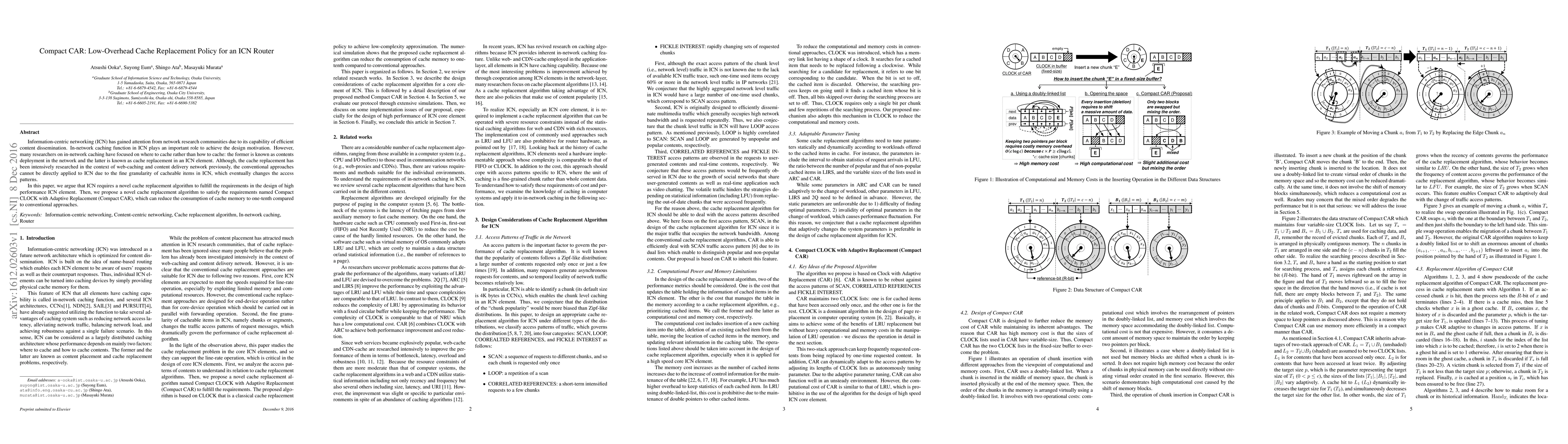 This paper proposes a novel cache replacement algorithm named Compact CLOCK with Adaptive Replacement (Compact CAR) for Information-Centric Networking (ICN) routers, aiming to optimize cache memory usage. The new approach reduces cache memory consumption by up to one-tenth compared to conventional methods.