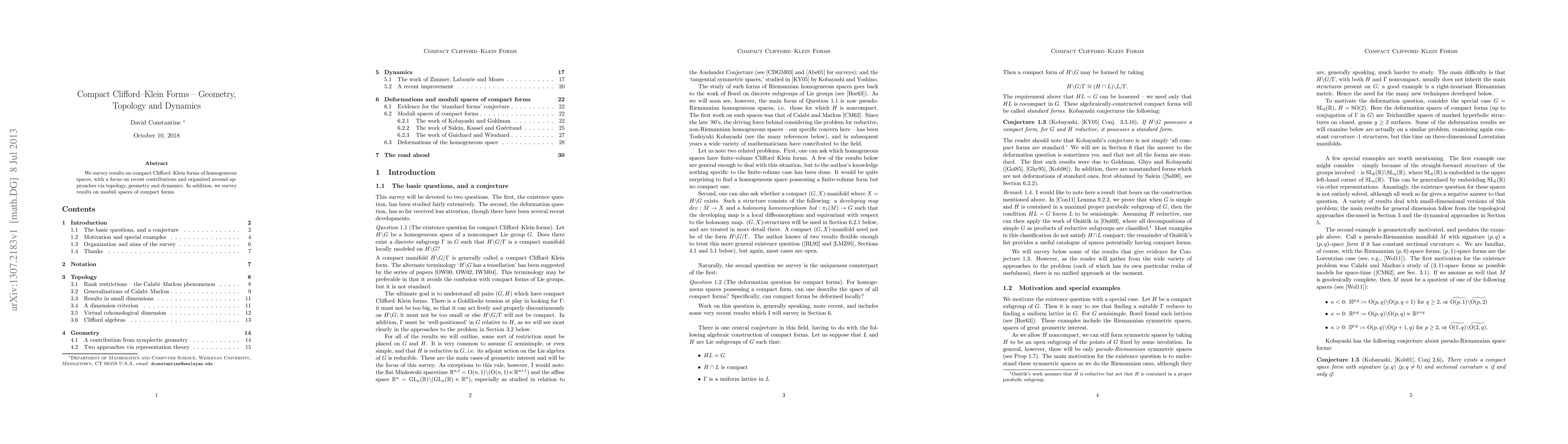 We survey results on compact Clifford-Klein forms of homogeneous spaces, with a focus on recent contributions and organized around approaches via topology, geometry and dynamics. In addition, we survey results on moduli spaces of compact forms.
