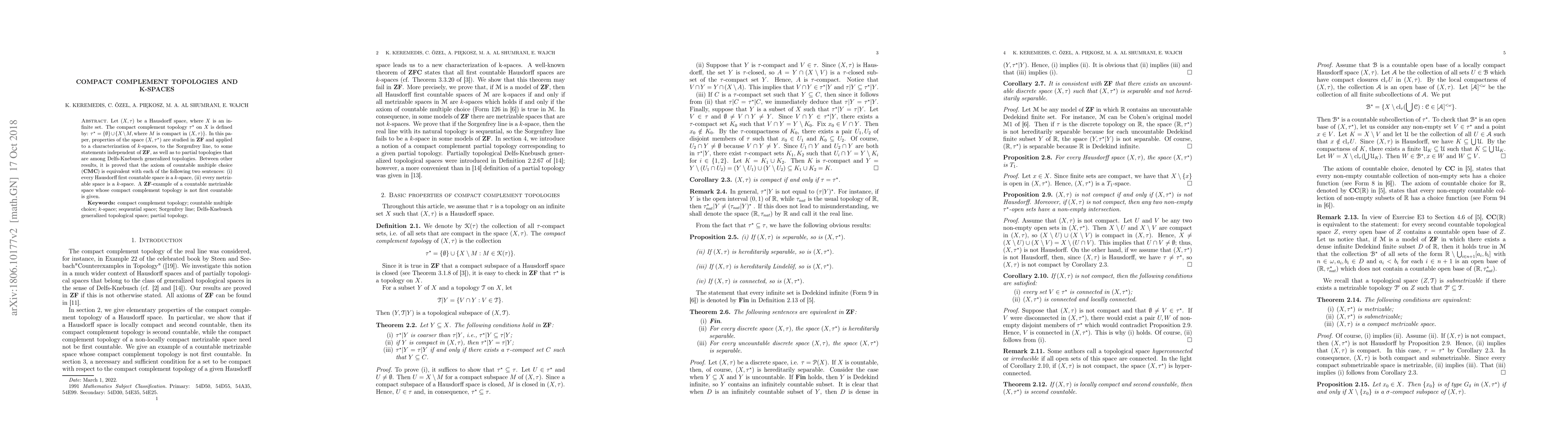 Let $(X,\tau)$ be a Hausdorff space, where $X$ is an infinite set. The compact complement topology $\tau^{\star}$ on $X$ is defined by: $\tau^{\star}=\{\emptyset\} \cup \{X\setminus M, \text{where $M$ is compact in $(X,\tau)$}\}$. In this paper, properties of the space $(X, \tau^{\star})$ are studied in $\mathbf{ZF}$ and applied to a characterization of $k$-spaces, to the Sorgenfrey line, to some statements independent of $\mathbf{ZF}$, as well as to partial topologies that are among Delfs-Knebusch generalized topologies. Among other results, it is proved that the axiom of countable multiple choice (\textbf{CMC}) is equivalent with each of the following two sentences: (i) every Hausdorff first countable space is a $k$-space, (ii) every metrizable space is a $k$-space. A \textbf{ZF}-example of a countable metrizable space whose compact complement topology is not first countable is given.
