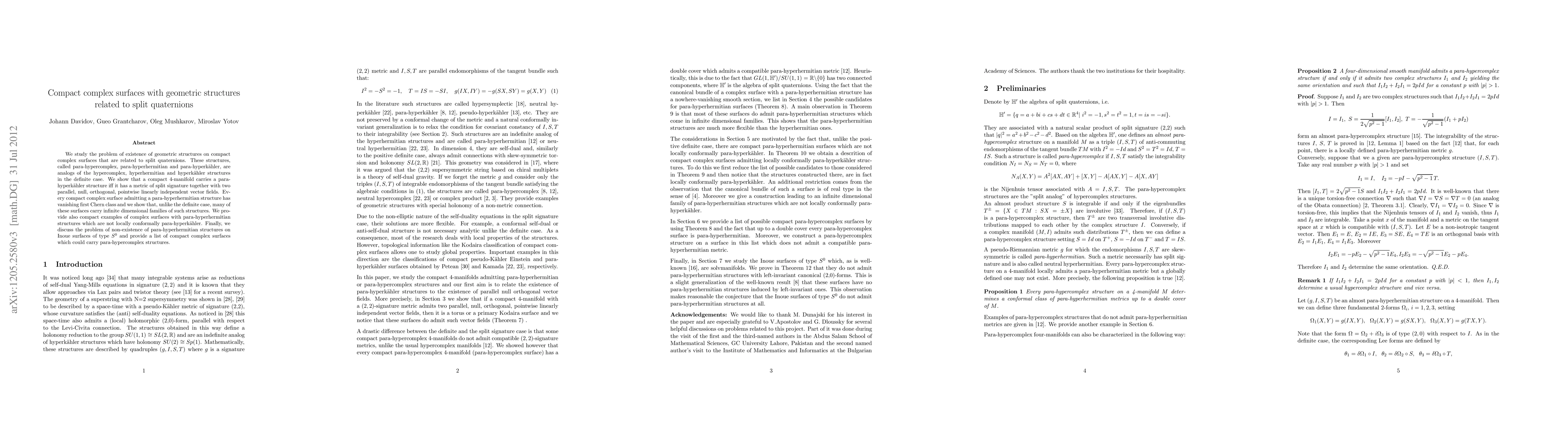 This paper explores the existence of para-hypercomplex structures on compact complex surfaces linked to split quaternions, demonstrating that certain conditions involving split signature metrics and vector fields enable para-hyperkähler structures. It also reveals that surfaces with para-hyperhermitian structures have vanishing first Chern class and often support infinite families of such structures.