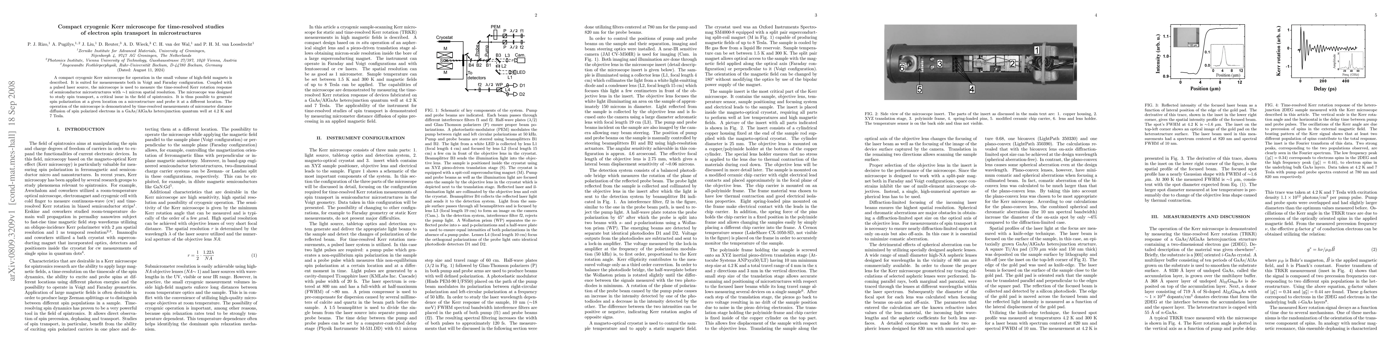 A compact cryogenic Kerr microscope measures spin transport in microstructures with ~1 micron spatial resolution, enabling time-resolved studies of electron spin polarization at 4.2 K and 7 Tesla.